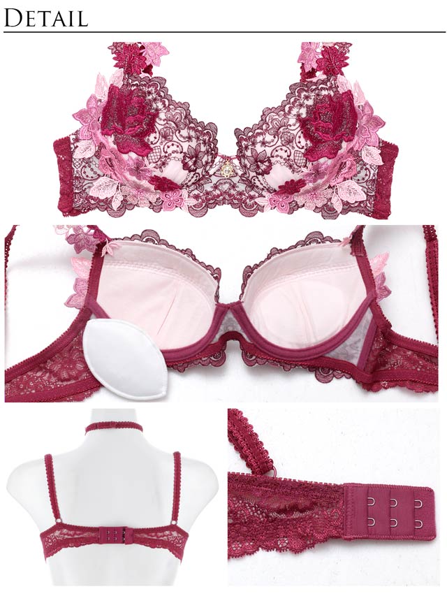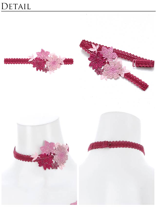 貴婦人のドレスをイメージした繊細な刺繍レースをブラジャーカップとアンダー部分にたっぷりと使い、さらに上からこれでもかというほど大きなフラワーモチーフをあしらいました。 フラワーガーデンをイメージしたモチーフは、バラやマーガレットなど、様々なお花が咲き誇ります。ラメ糸をふんだんに使用したケミカルモチーフは立体的で、艶やかなお花を表現しています。 ショーツはストラッピーデザインでバックスタイルまでセクシーに拘りました。チョーカーとキャットガーターまでセットになった、豪華な1着に仕上がりました。