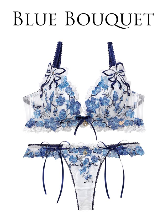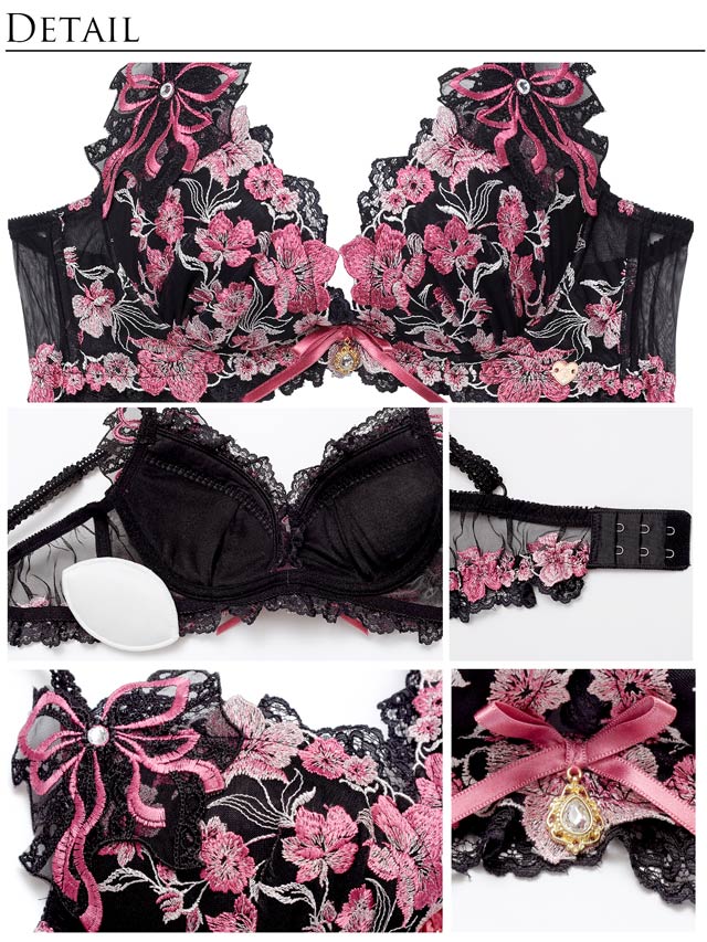 両カップ脇には、レースとリボンを刺繍したチュールモチーフをあしらい、ブラジャー中心には大粒のラインストーンがきらめくアクセントに◎