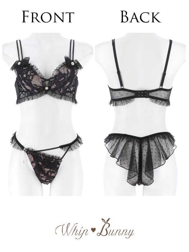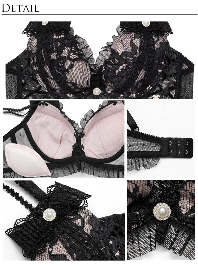 肩には立体的なリボンモチーフをあしらい、まるでお洋服のような華やかなデザインに仕上げました!またリボン中央とブラの中心にはきらりと輝くビジューボタンを添え、上品なアクセントをプラス。