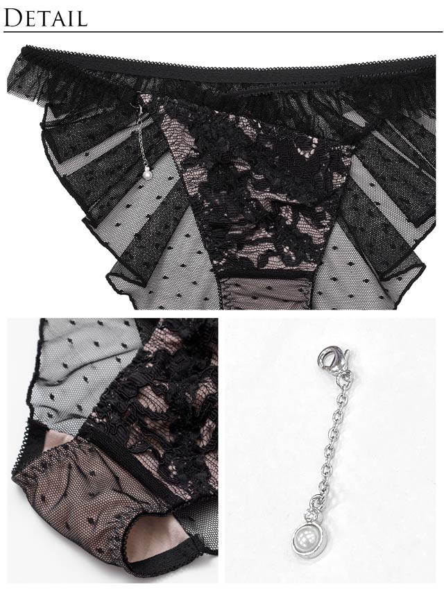 フルショーツの後ろにはふんわり透け感のあるフレアをたっぷり施し、繊細さの中に華やかさをプラスしています。