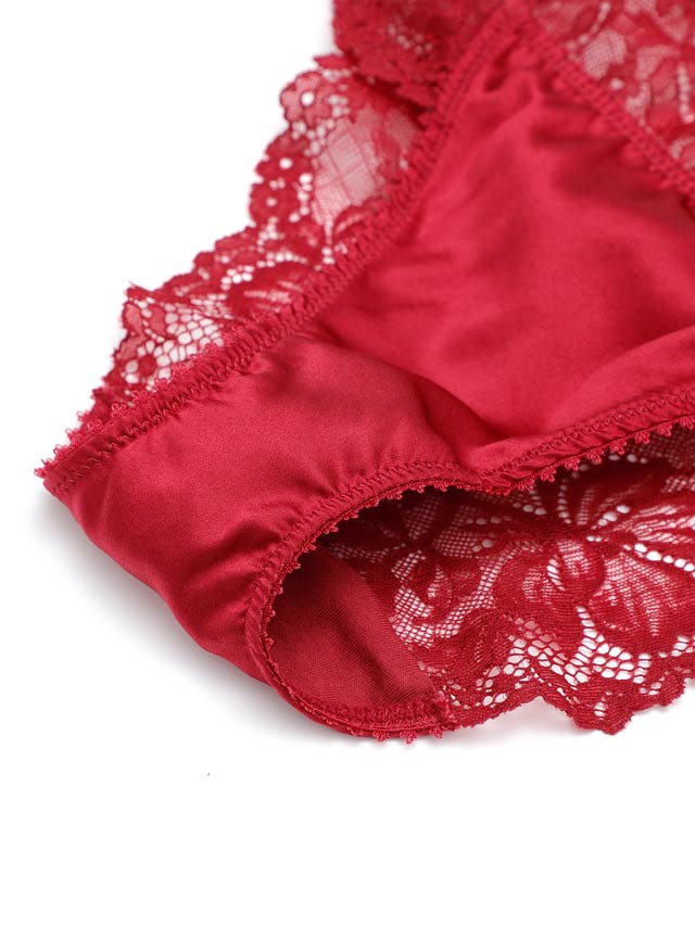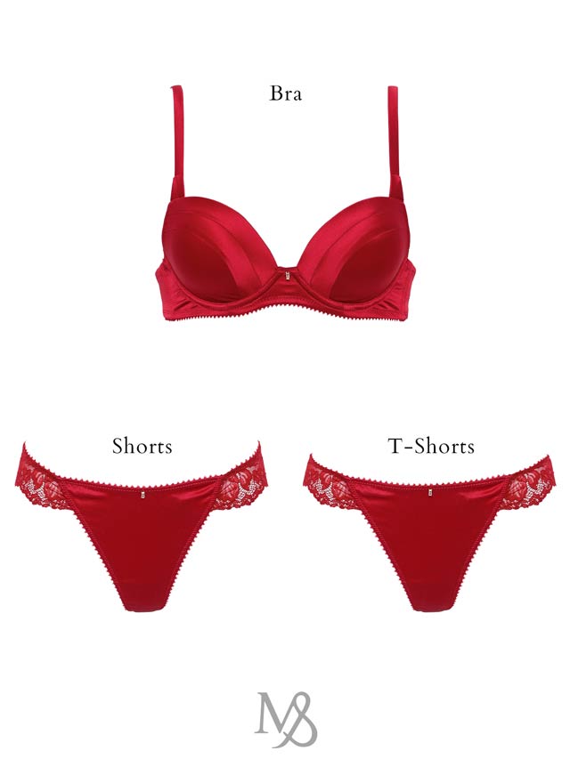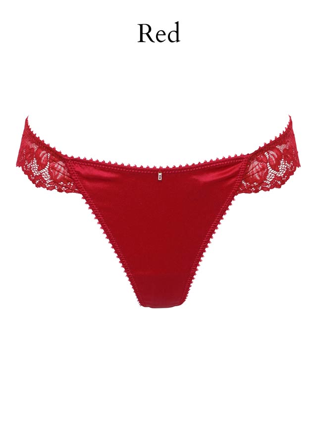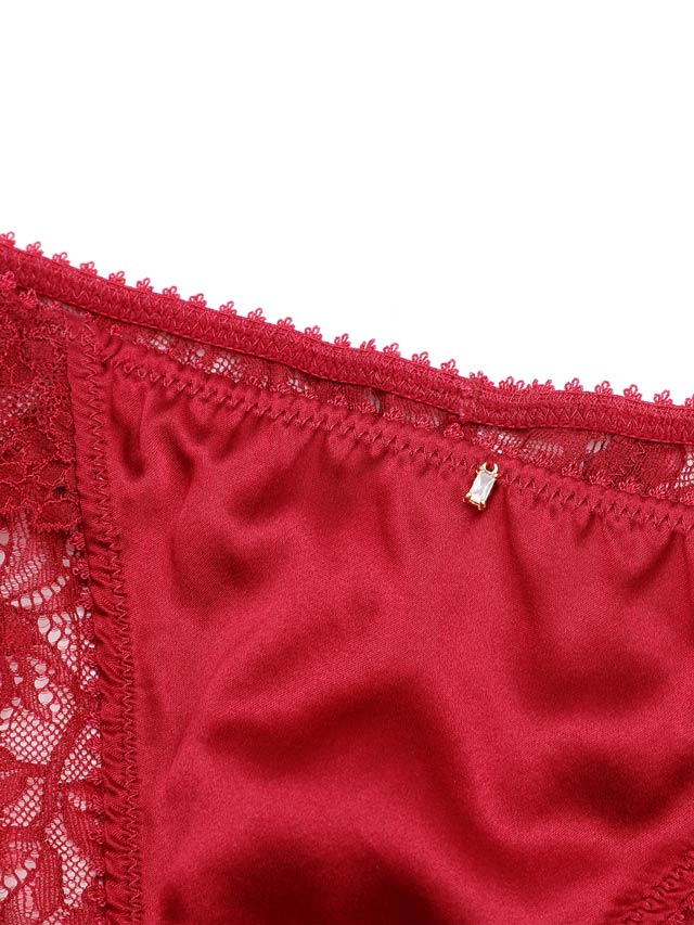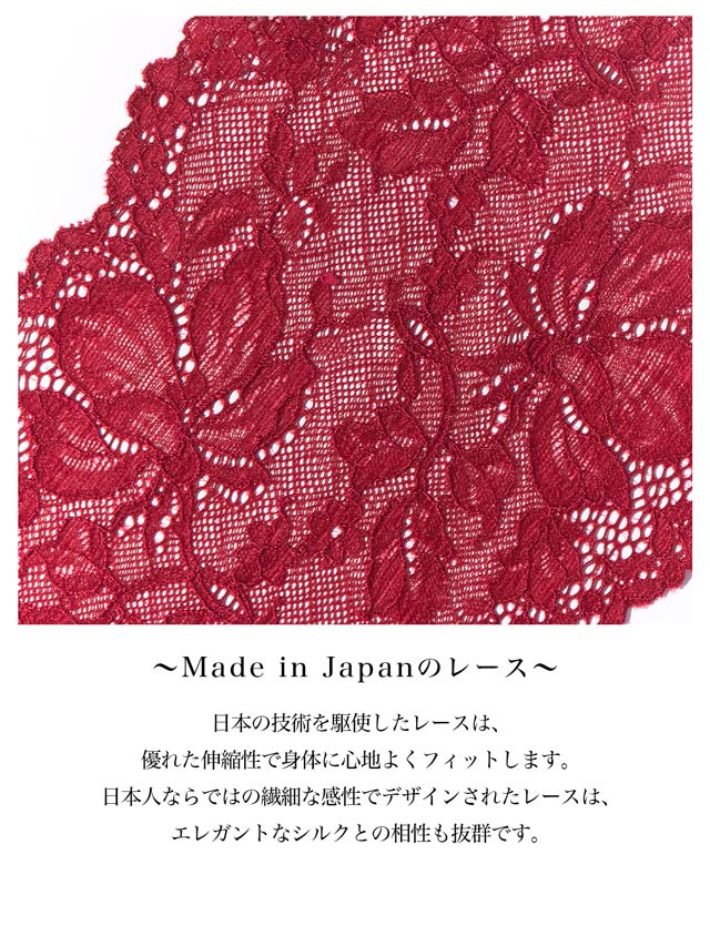 高級シルクを使用したランジェリー。前身頃はシンプルにシルクの光沢感をふんだんに魅せ、後身頃は伸縮性のあるレースショーツにしました。日本製の編みレースは肌触りも良く、肌に自然とフィットしてくれます。中心チャームは恋人から贈られたジュエリーをイメージしました。シャンパンゴールドは肌に溶け込むカラーでアウターに響きにくい、深みのあるレッドは肌の色を血色よく、美しく魅せてくれます。 大人の女性に贈るランジェリーです。