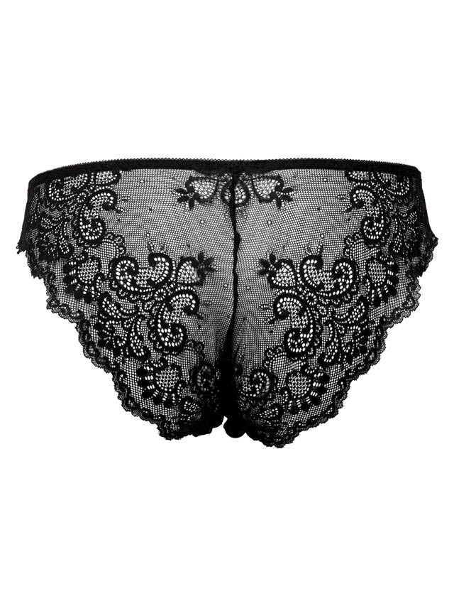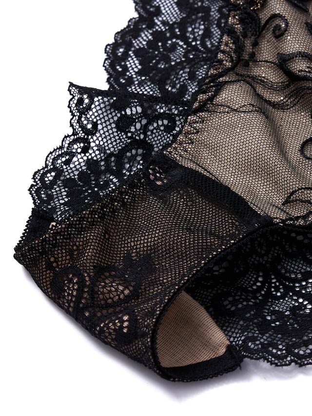 繊細なアラベスク柄が美しい日本製の編みレースをショーツバックに使用。華奢な作りで、女性らしさを引き立てます。