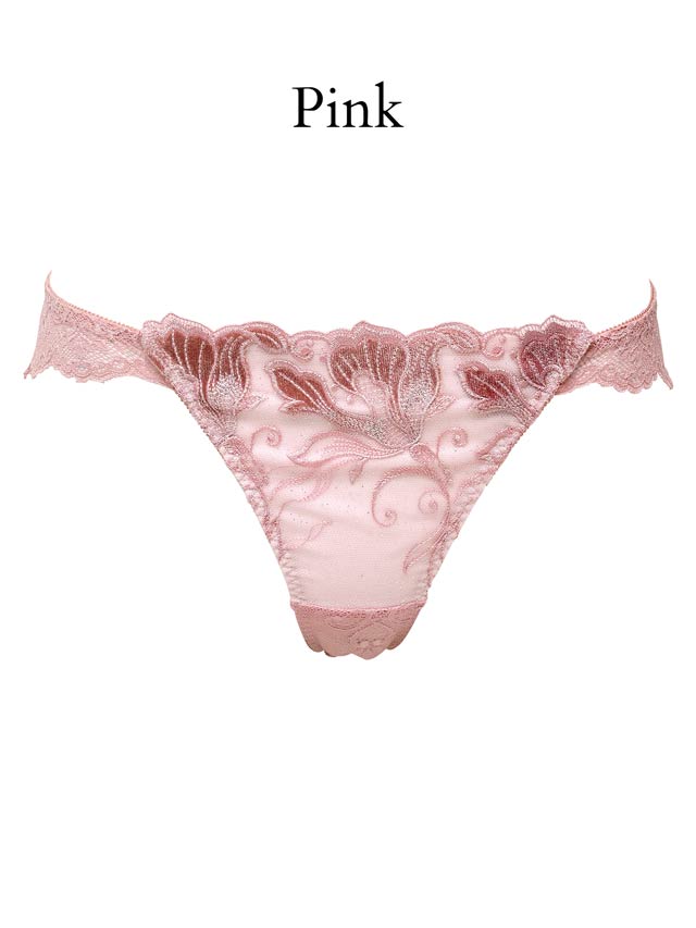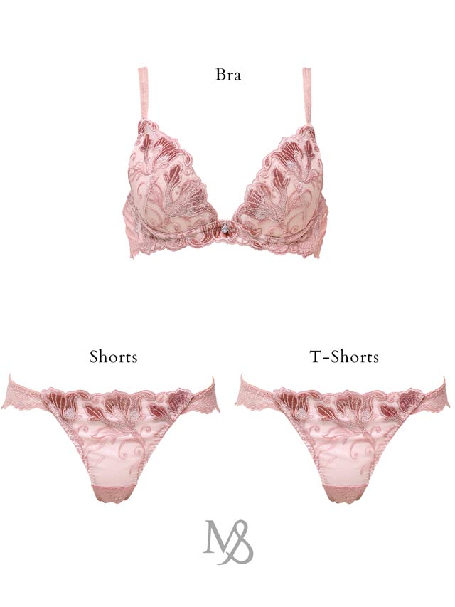 一部にベロア生地を使用する"ステックレース"という特殊な技法を用いた上海のレースが高級感を放つランジェリー。BLACKにはゴールドのラメ糸で、PINKにはシルバーのラメ糸でそれぞれ刺?されたエキゾチックな花は、大人の女性の気品を醸し出します。ベロア生地の毛並みによって光沢感が変わるので、手に取った時と、着用した時とはまた違った魅力を見せてくれることでしょう。レース下にはラメチュールを入れてより一層豪華に仕上げました。