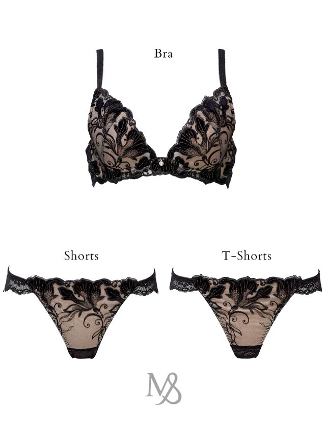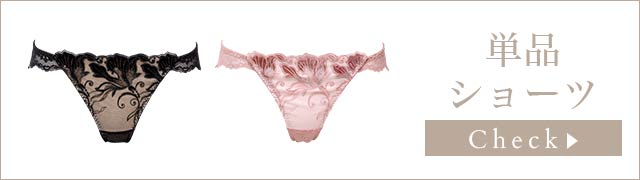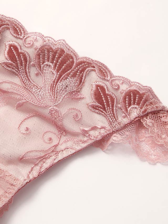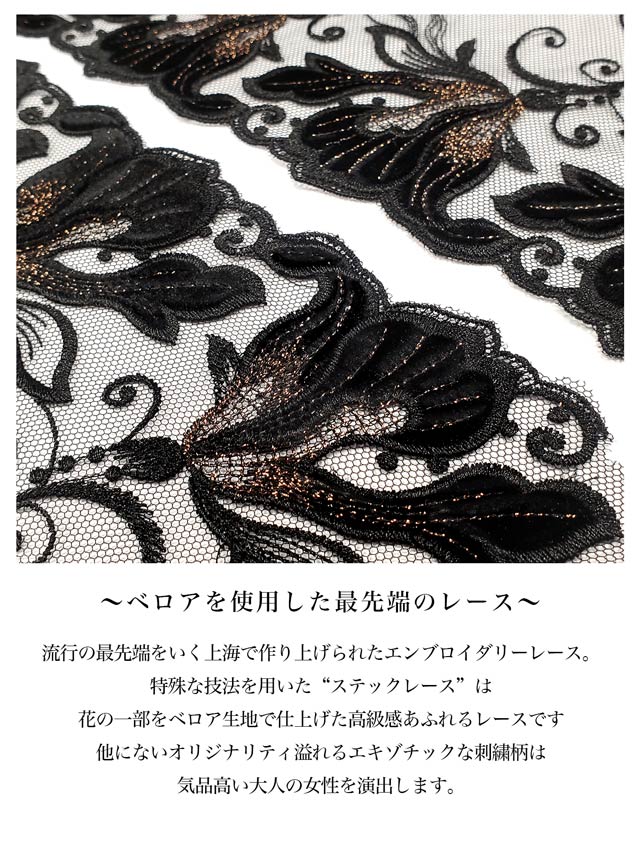 一部にベロア生地を使用する"ステックレース"という特殊な技法を用いた上海のレースが高級感を放つランジェリー。BLACKにはゴールドのラメ糸で、PINKにはシルバーのラメ糸でそれぞれ刺?されたエキゾチックな花は、大人の女性の気品を醸し出します。ベロア生地の毛並みによって光沢感が変わるので、手に取った時と、着用した時とはまた違った魅力を見せてくれることでしょう。レース下にはラメチュールを入れてより一層豪華に仕上げました。