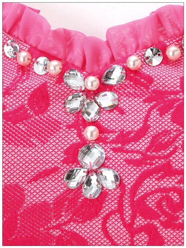 同色の花柄ペプラムにライン入りのシンプルスカートを組み合わせたミニドレス。フリルで縁取られたオフショルダーはデコルテが露出するSexyなデザイン。胸元にはパールxビジューが配置され華やかさをアップします。印象の違うビビッドカラーとモノトーンの3色からお選びいただけます。