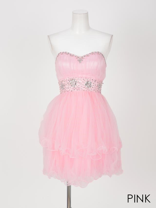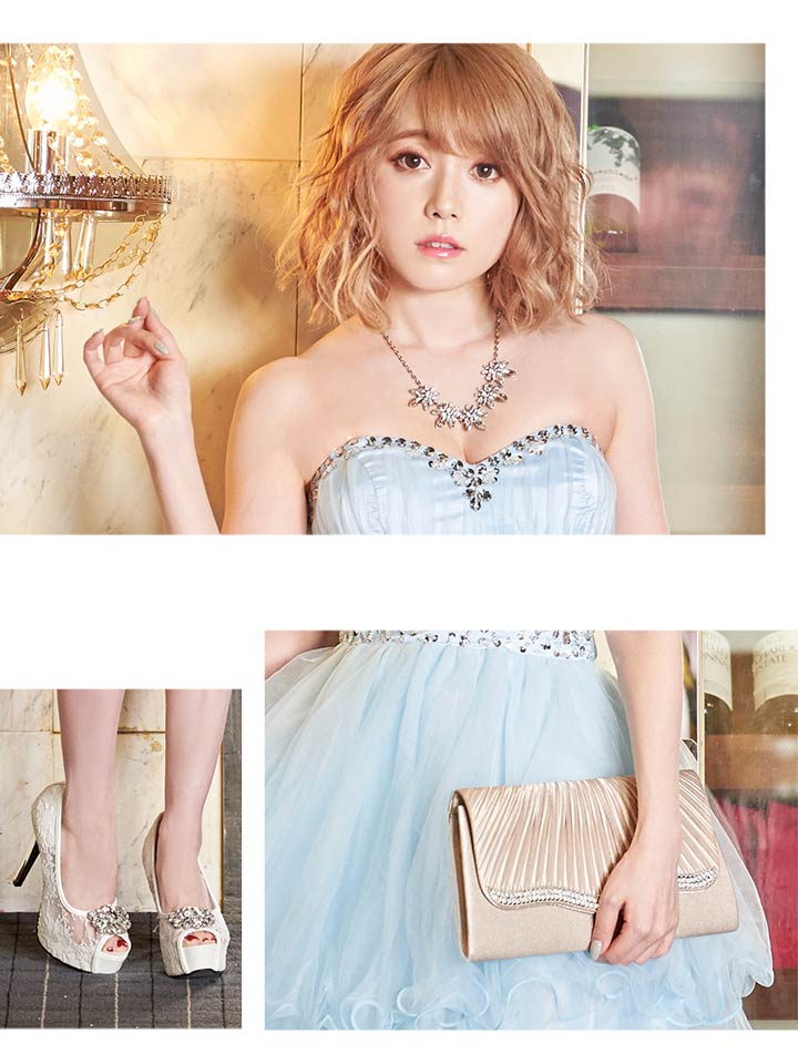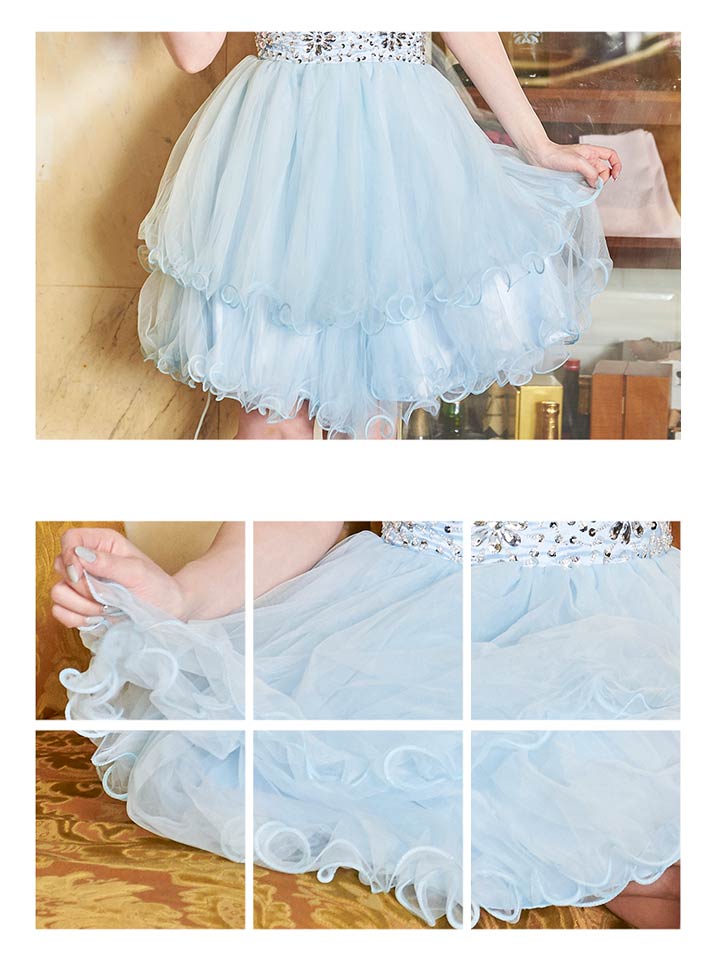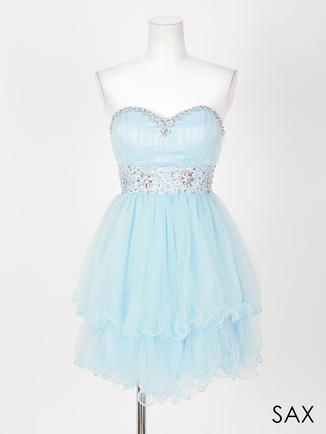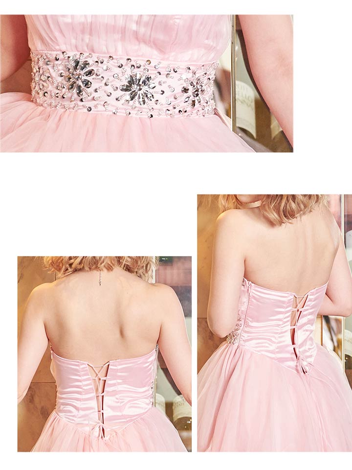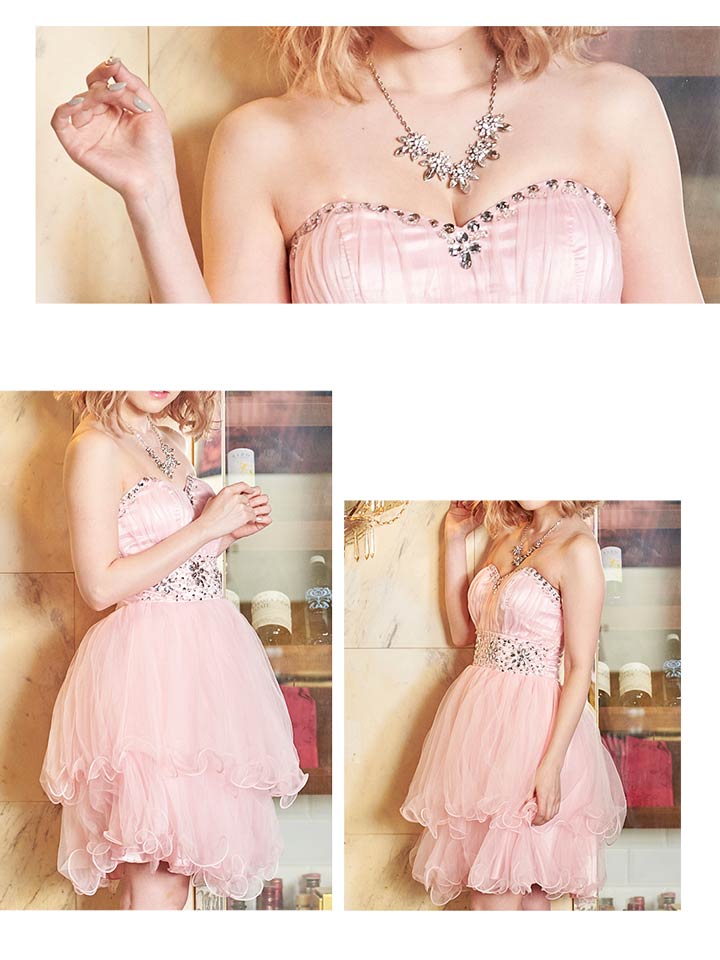 胸元とウエストに豪華なビジューをふんだんにあしらったAラインミニドレス。ハイウェストの切り替えでフワっと広がるスカートがまるで妖精のように可愛いです。さらにパステルカラーが女の子らしさをアUPさせてくれます!ウエストまで編み上げになっているので、自分にあわせて自由に着れる1着。Aラインで足元をスラっと美しく、豪華なビジューはデコルテラインを華やかに演出。この価格でお値段以上のクオリティーに仕上がりました♪
