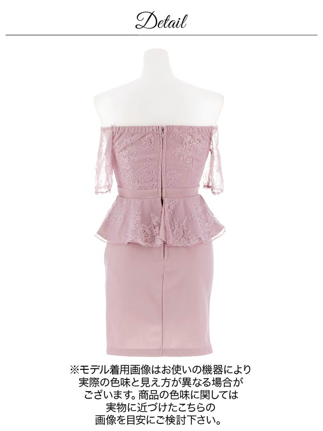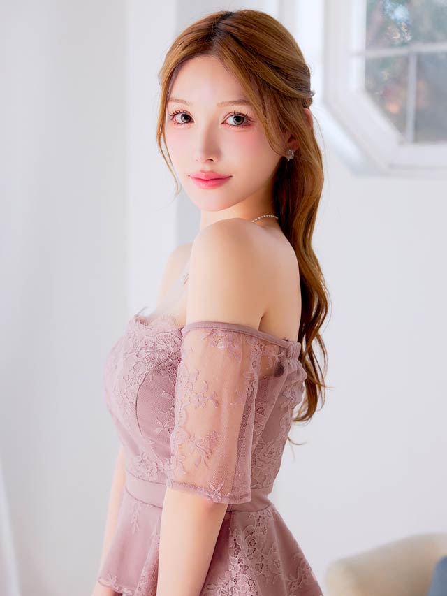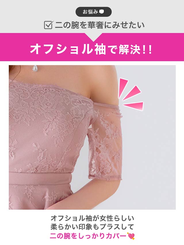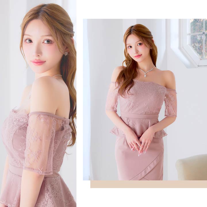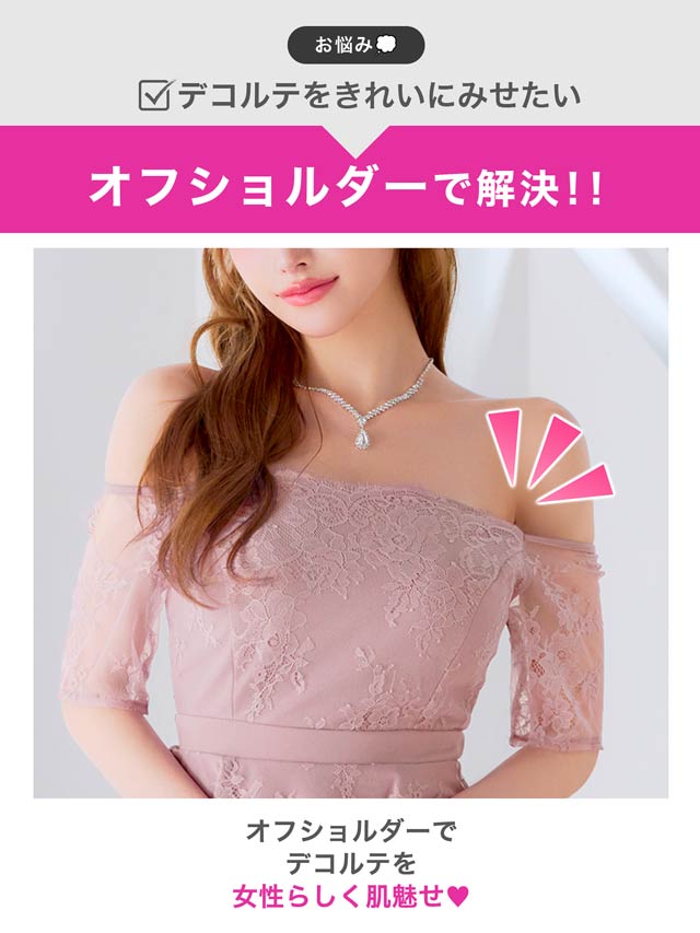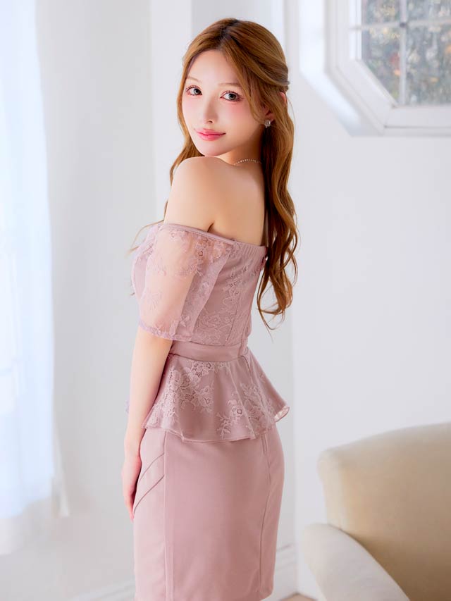 レースが上品に映えるオフショルデザインでデコルテを美しく魅せるキャバドレス。ハイウエストのペプラムが自然なくびれを演出し、女性らしいメリハリのあるシルエットに◎程よく透けるレース袖が色っぽさをプラスしつつ気になる二の腕もカバーしてくれます♪