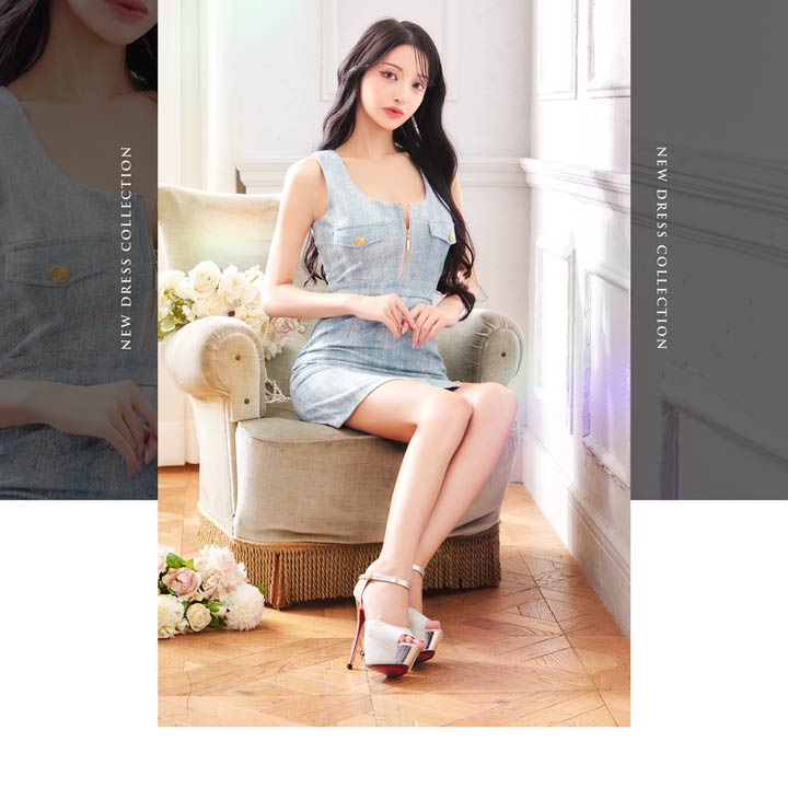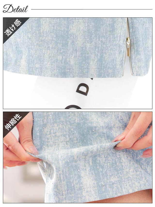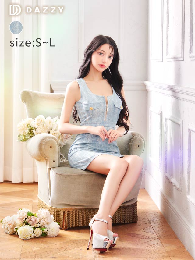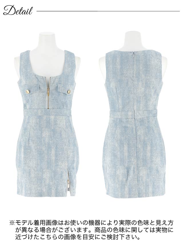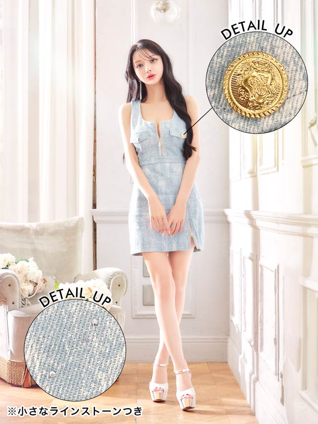 淡いデニム生地にキラリと輝く小さなラインストーンを散りばめたミニドレス。胸元やスリット部分のジップがトレンド感溢れる肌魅せを叶えます◎ カジュアルにも綺麗めにもコーディネートできるファッション性豊かな1着です。