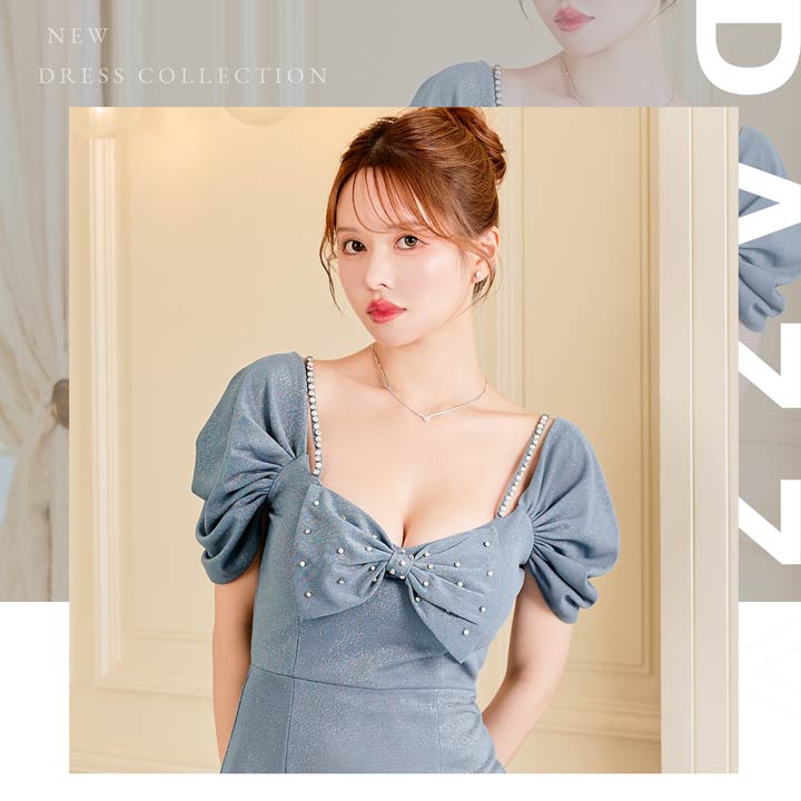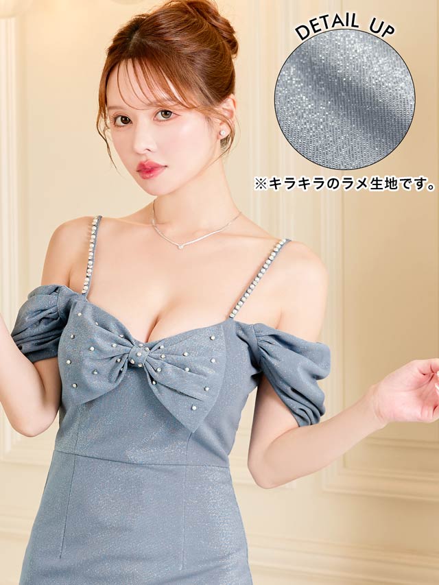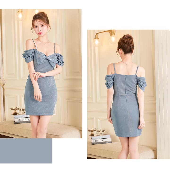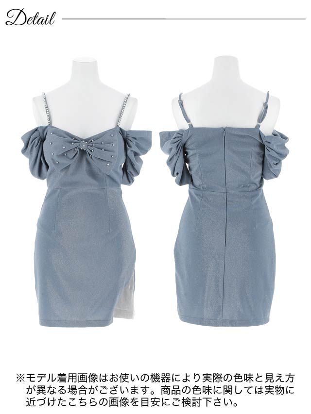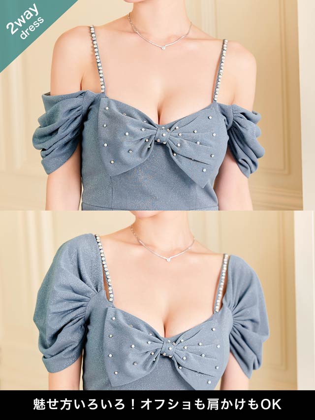 胸元に飾られた大きなリボンがとってもキュートなミニドレス。肩紐からあしらわれたラインストーンとパールビジューが上品な輝きを放ちます♪ パフスリーブはセクシーなオフショル袖としてもアレンジ出来ちゃう2way仕様です◎