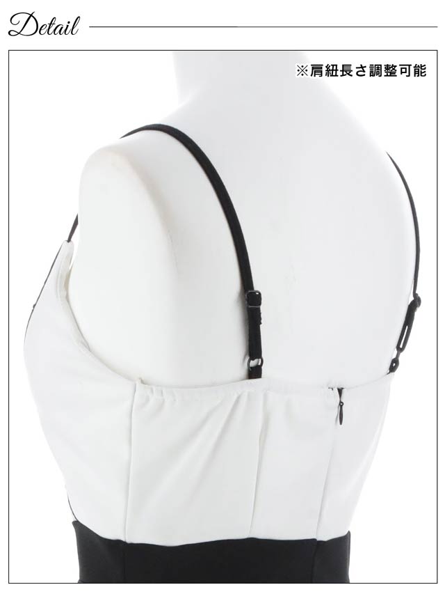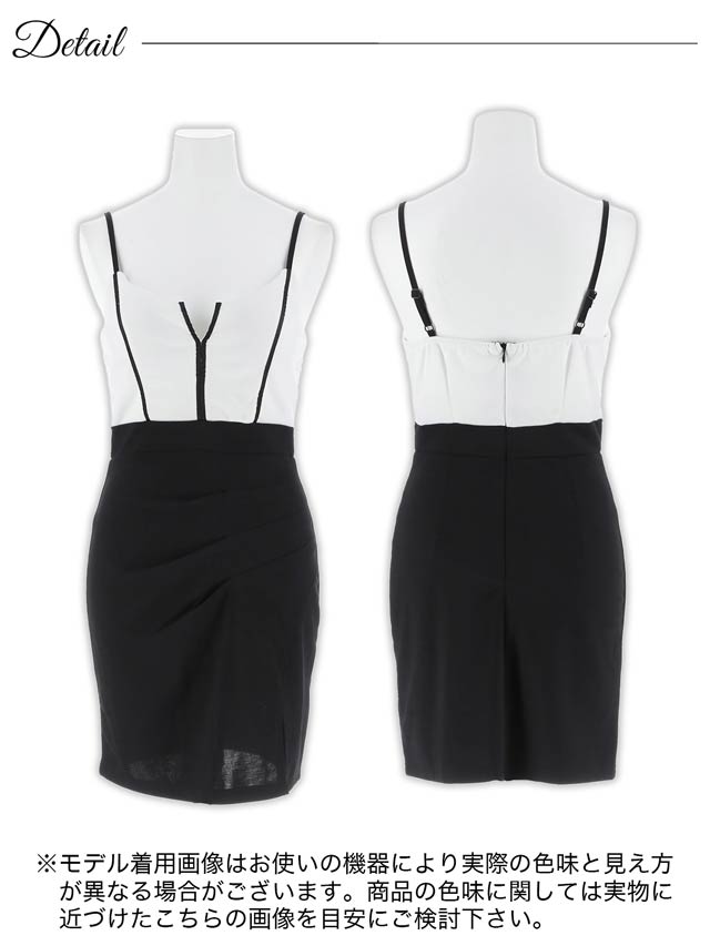 バイカラー配色のV字カットラインが谷間を引き立てるミニドレス。華奢なキャミソールデザインがデコルテから大胆な肌魅せが叶います♪ スリット入りスカートで太腿をチラ見せ出来るのも大人セクシーなワンポイントです◎
