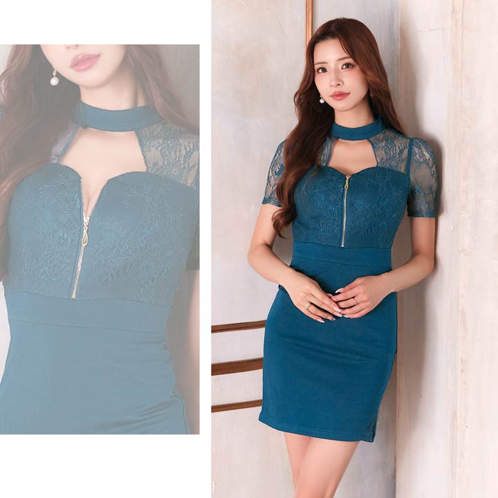 繊細なレースの透け感が女性らしい華やかさを演出するワンカラードレス。大胆に空いた胸元カットアウトとフロントジップが視線を惹きつけるセクシーなポイント♪ハイウエストの切り替えなので脚長効果も抜群な1着です!