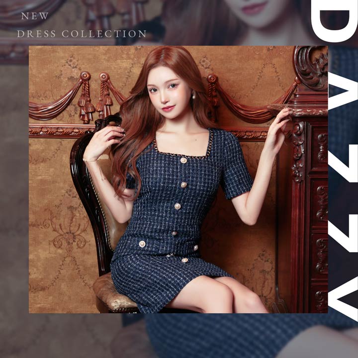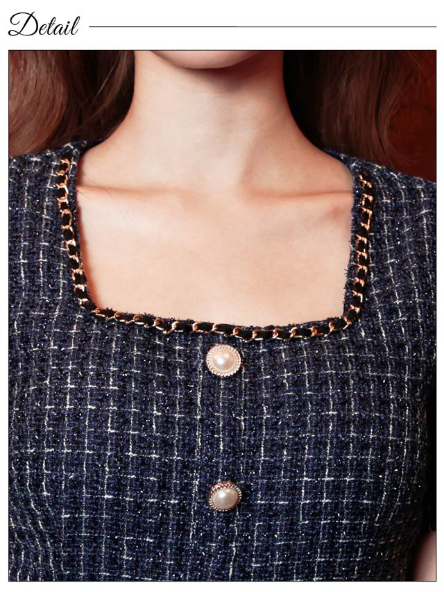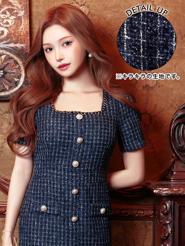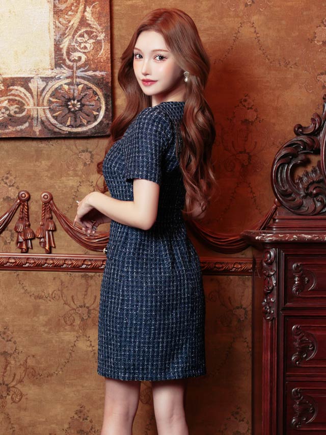 秋冬らしさを感じる濃紺なツイード生地にチェック柄でアクセントを効かせたミニドレス。デコルテから高見えするチェーンビジューや、大粒のパールボタンビジューが目を惹く1着。二の腕周りをカバーしてくれるの半袖仕様もおすすめです◎