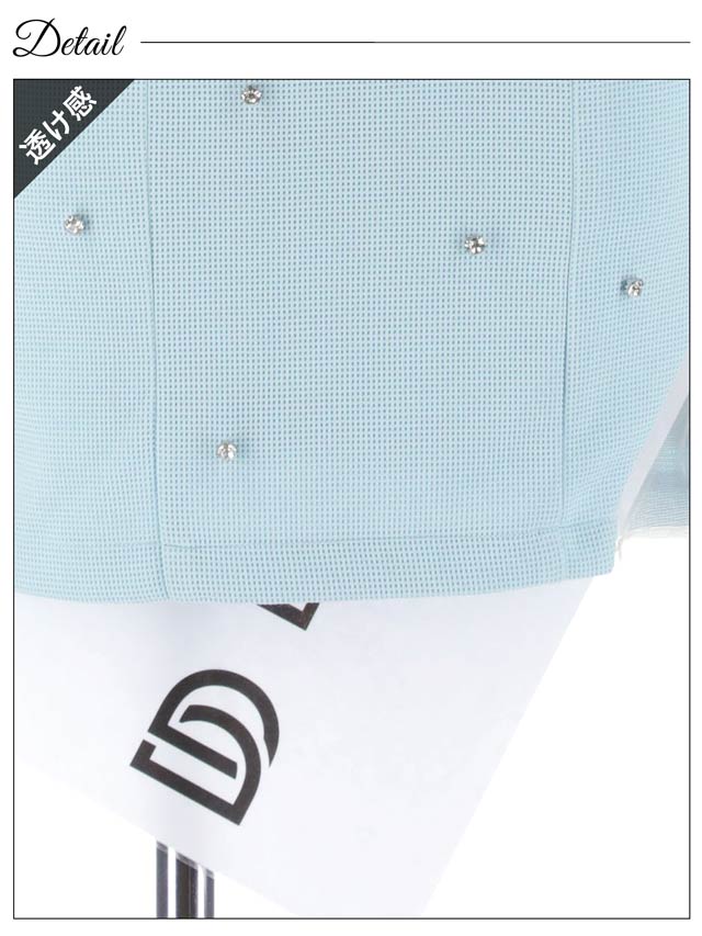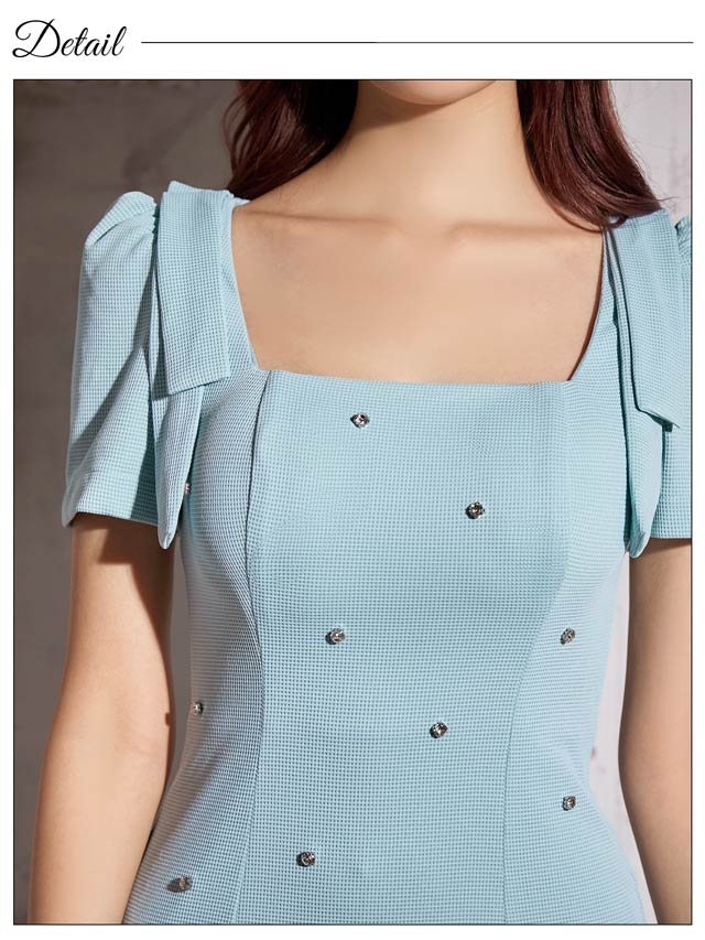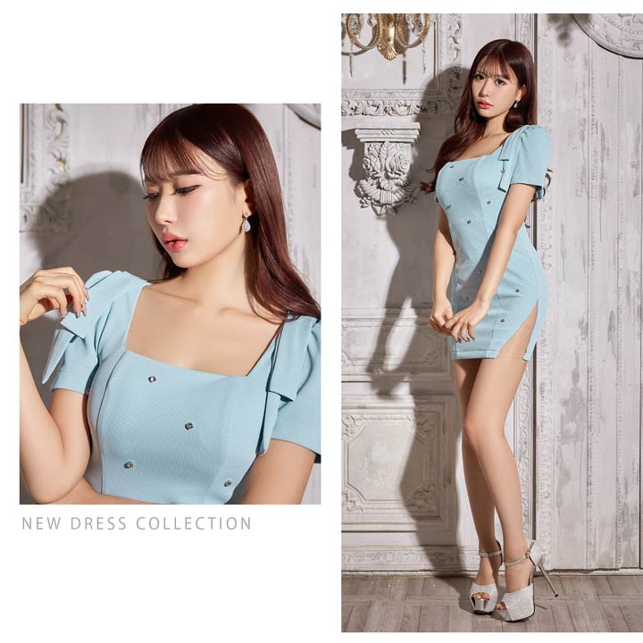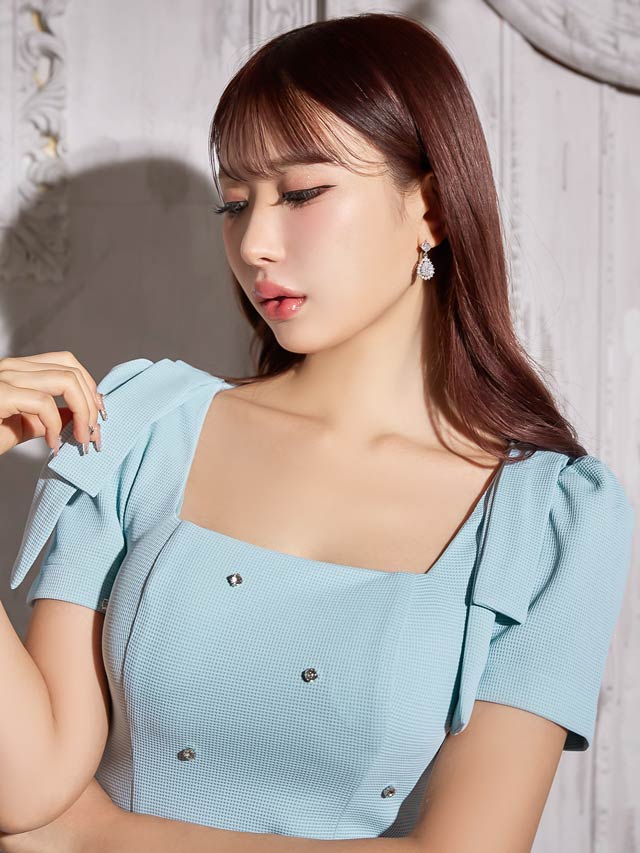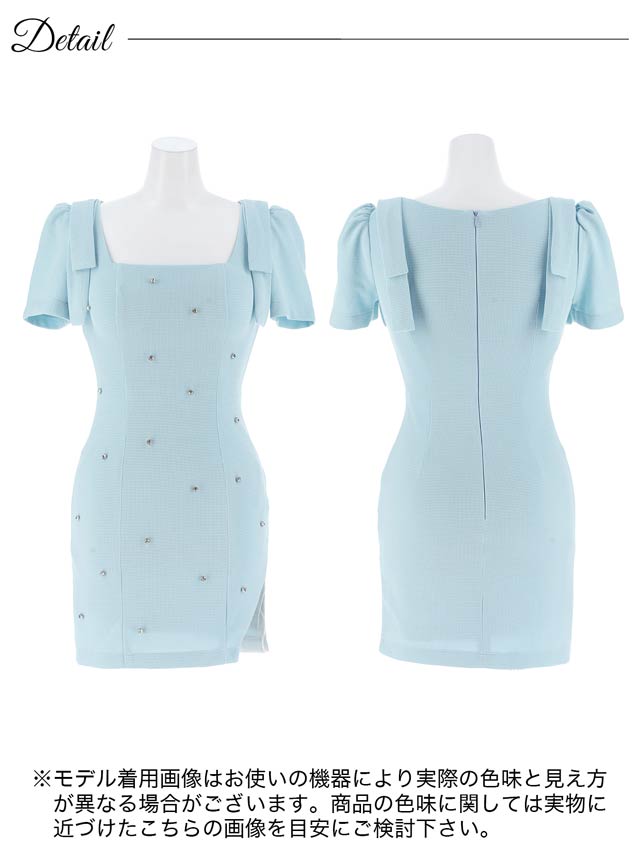 キラリと輝く大粒のラインストーンを散りばめた高見えドレス。女性らしいパフスリーブ部分にリボンを加え上品な甘さをプラスしました◎ 透け感のあるスリットから見える太腿が色っぽさを漂わせる1着です。