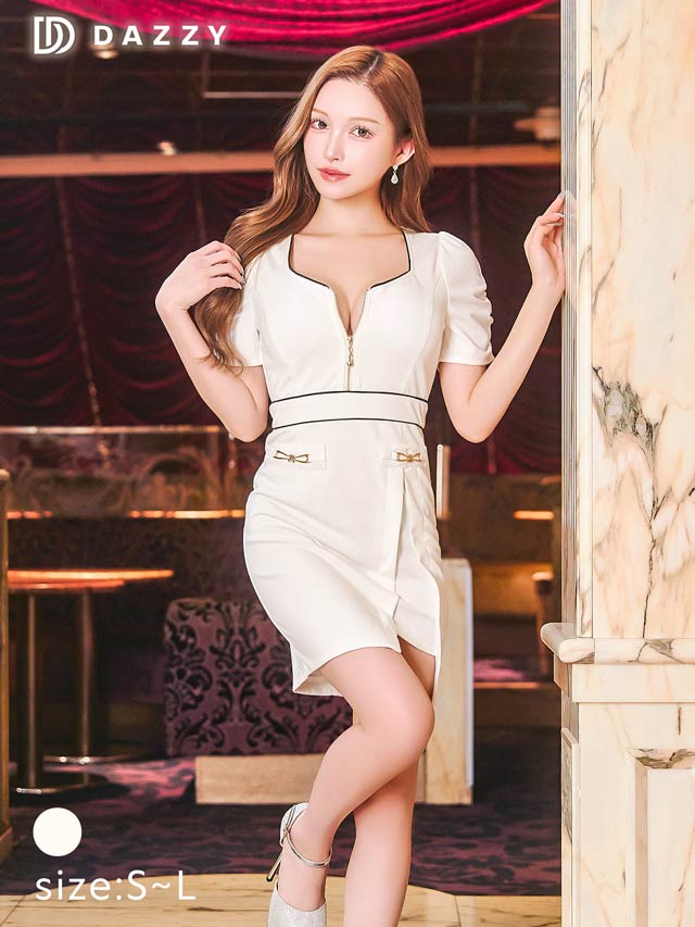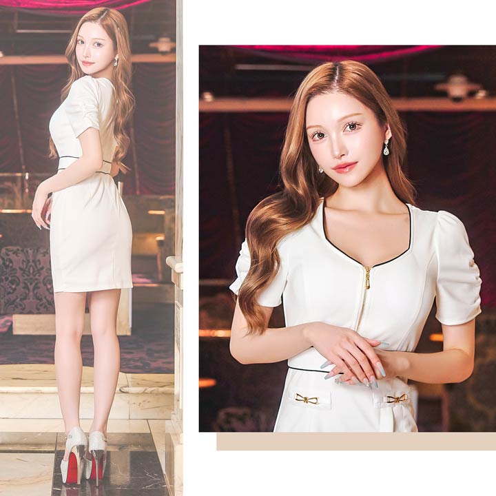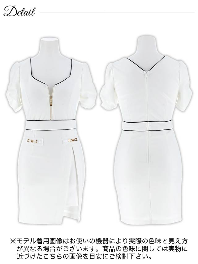 パイピング加工を施したフロントジップ仕様がアクセントになったミニドレス。サイドに大きく入ったスリットスカートがお洒落かつ、こなれ感漂う大人の色気を引き立たせます◎ ギャザーを寄せたパフスリーブで可愛らしさも欠かさない1着です。