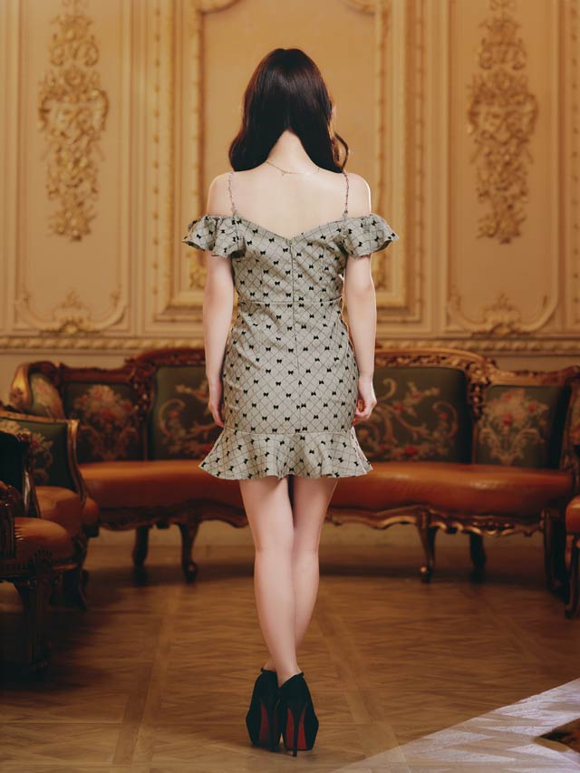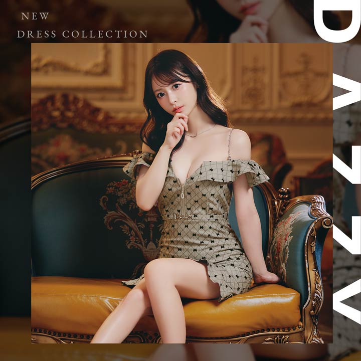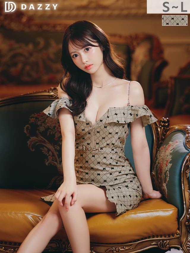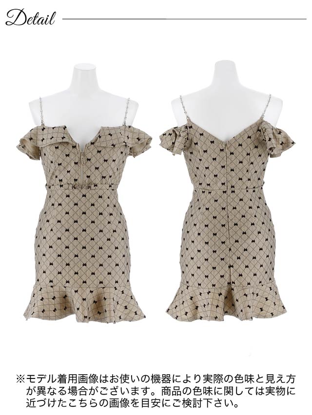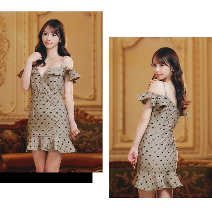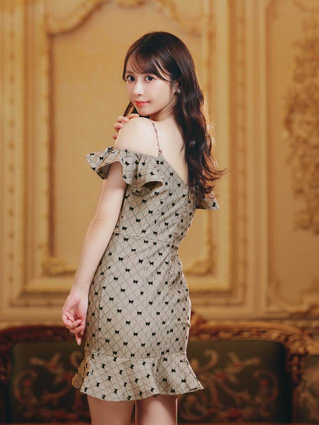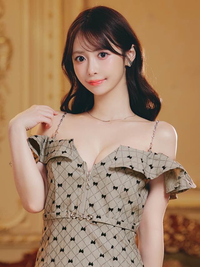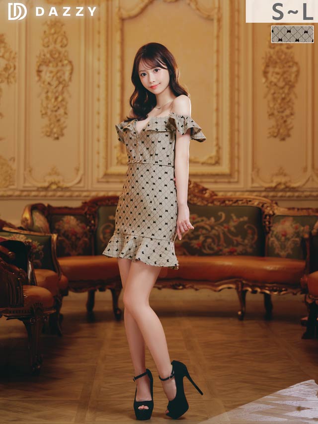 可愛らしいリボン柄が大人ガーリーな魅力を演出するミニ丈キャバドレス。オフショル×フロントジップでデコルテ&谷間を美しく魅せ、可愛いだけでなく色っぽさも抜群◎ハイウエストのベルト風デザインが自然にスタイルアップを叶える1着です!