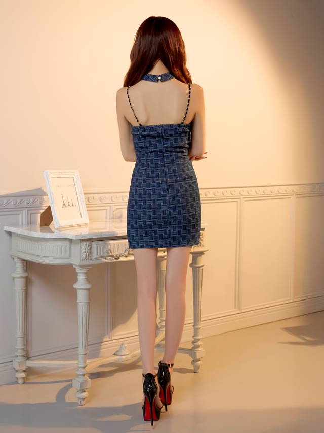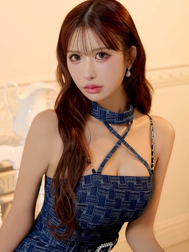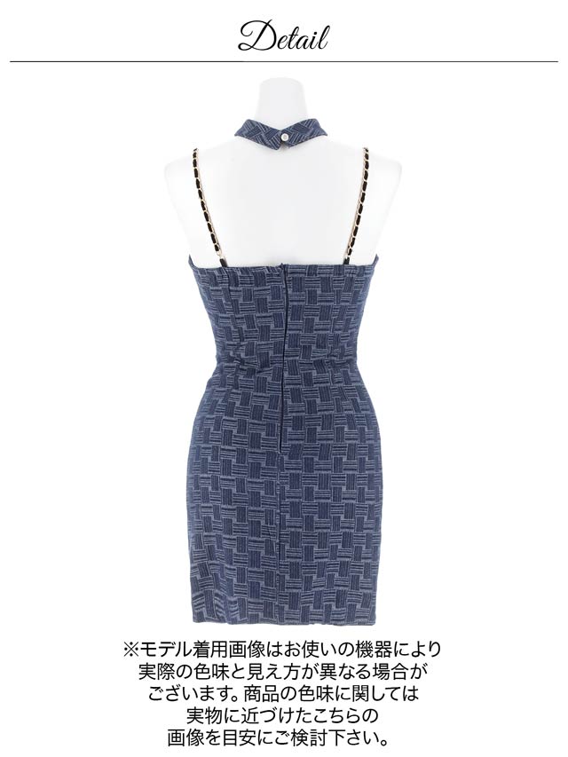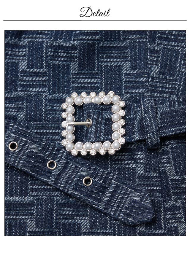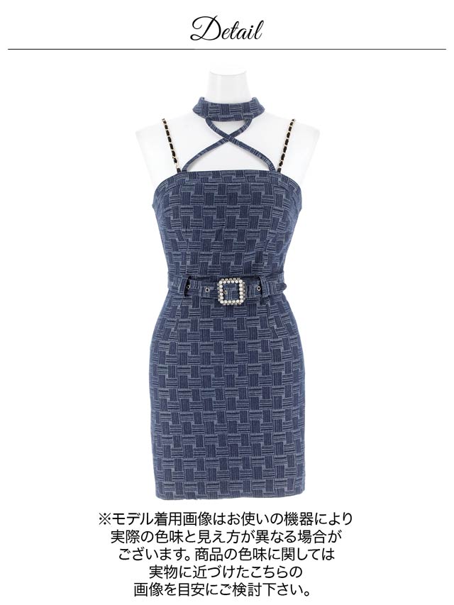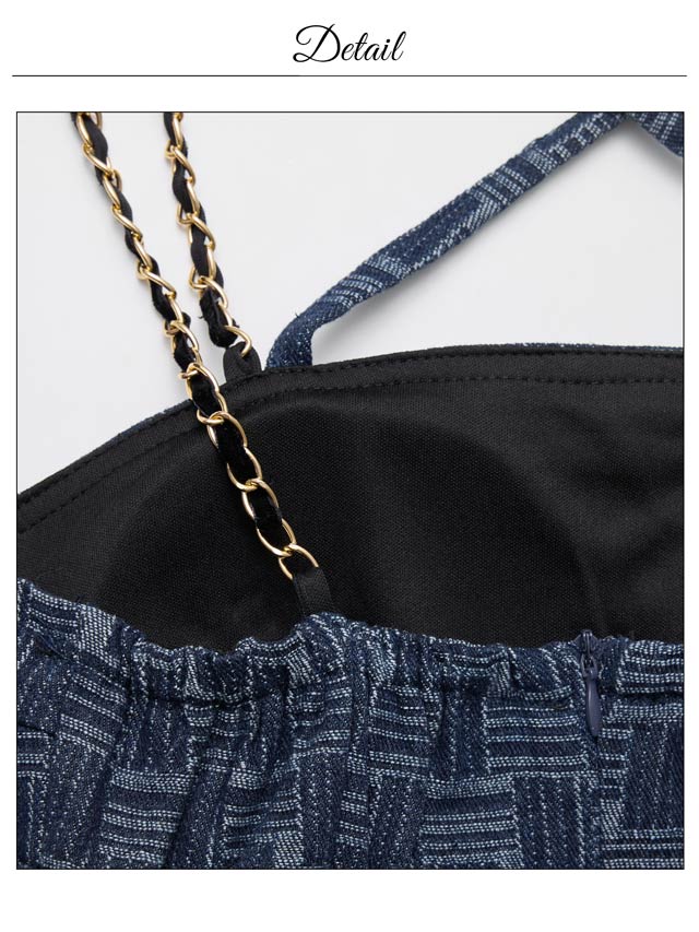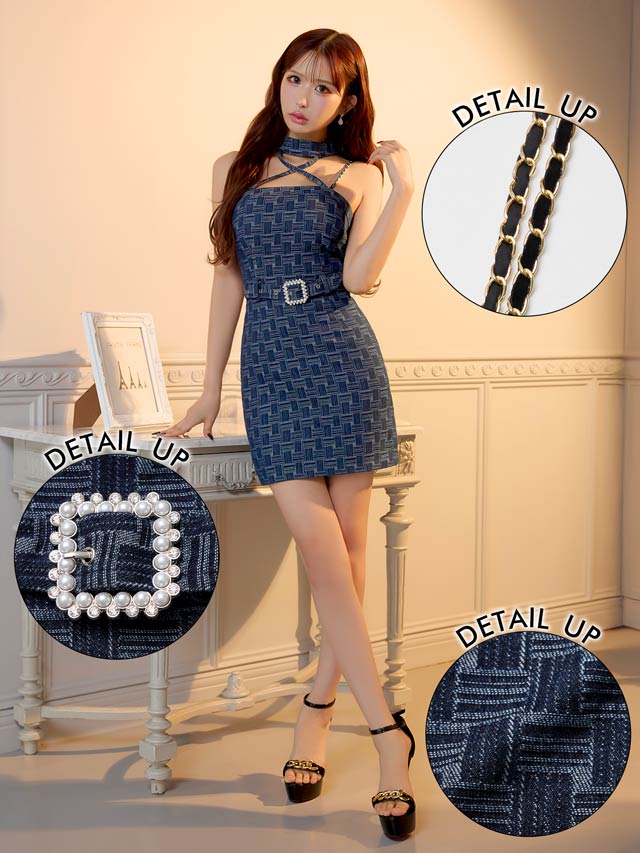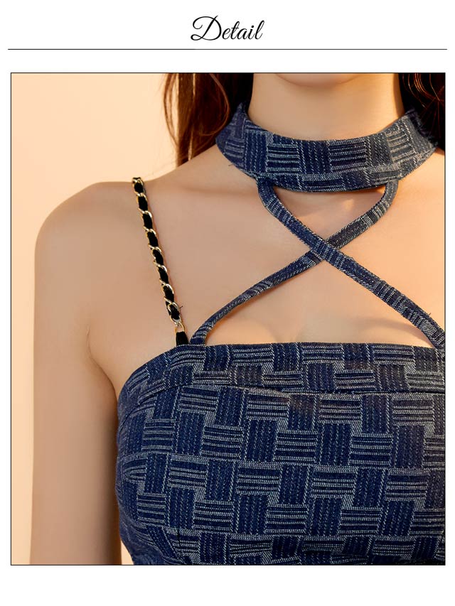 デコルテを引き立てるクロスデザインと、華奢なチェーンストラップが大人セクシーな印象を演出♪パールビジュー付きのスクエアバックルがきらめき、コーデに華やぎを添えてくれます。ハイウエストのベルトモチーフでくびれを強調しスタイルアップ効果も抜群の1着です!
