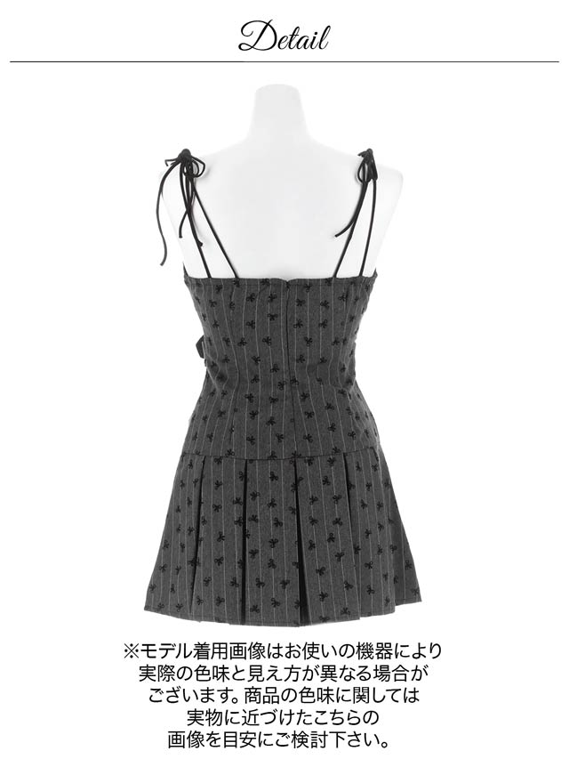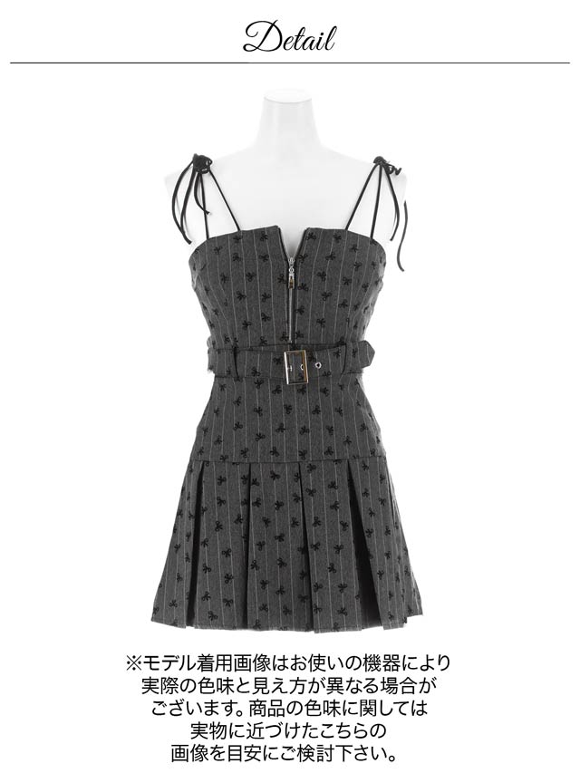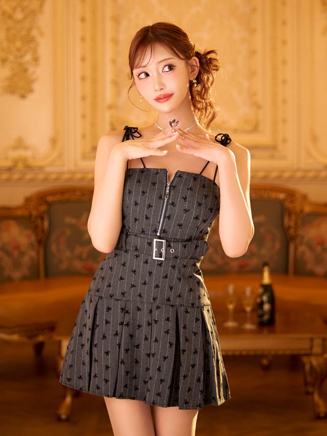 キュートなリボン柄&ショルダーリボンのキャミデザインで大人ガーリーに仕上げたキャバドレス。フロントジップでバストの見せ方を調節できるので、可愛いだけでなくセクシーな魅力も◎さらにハイウエストのベルトモチーフ×Aラインシルエットがメリハリのある美スタイルを演出します♪