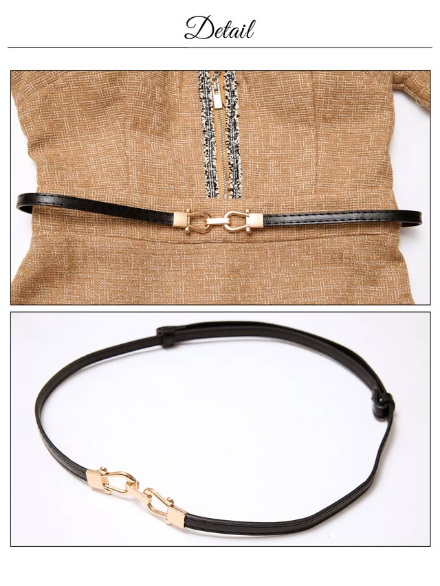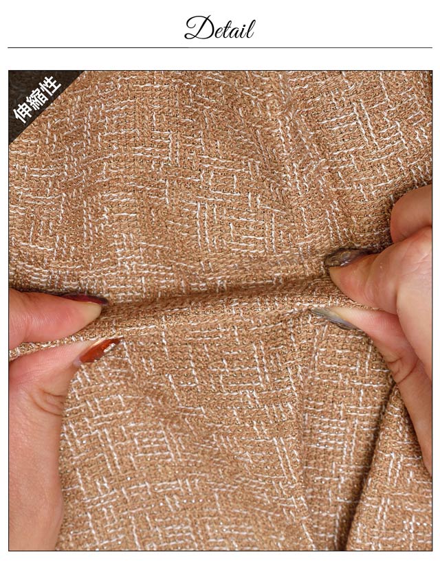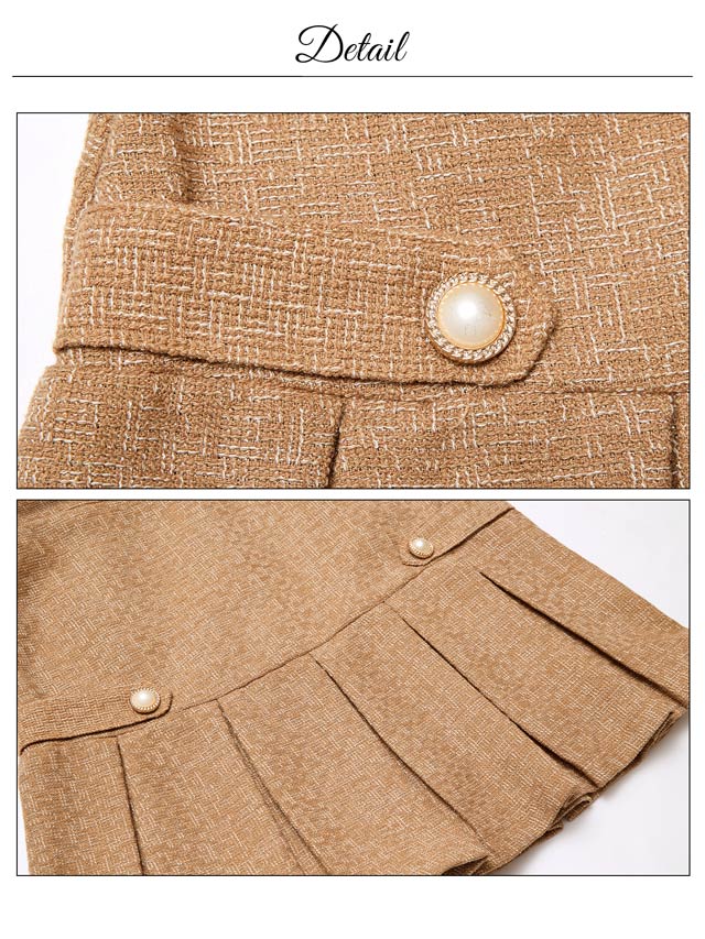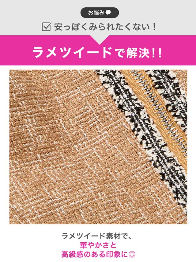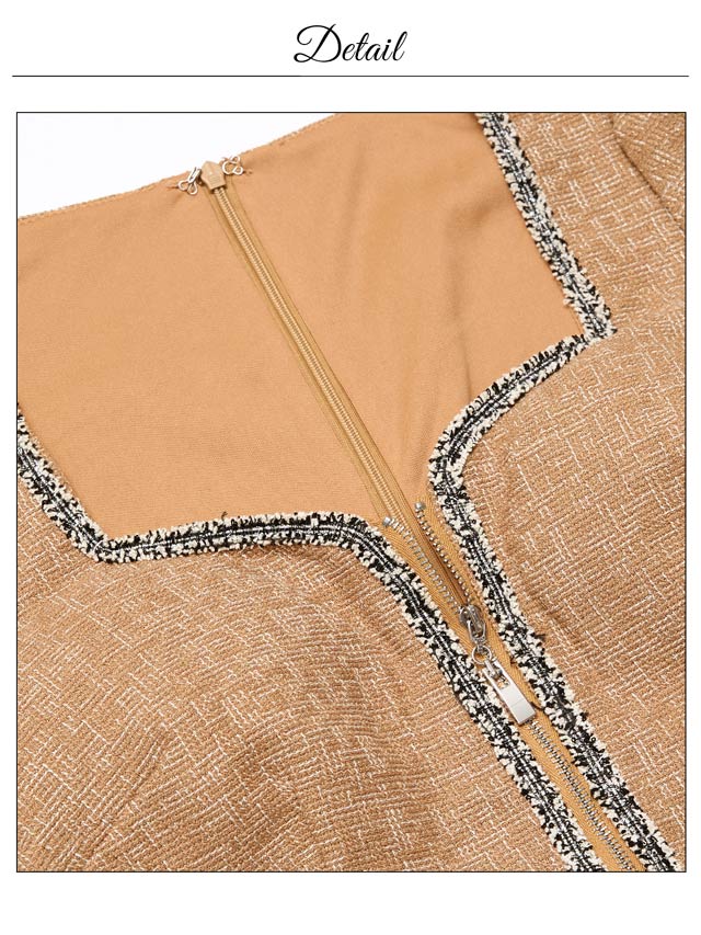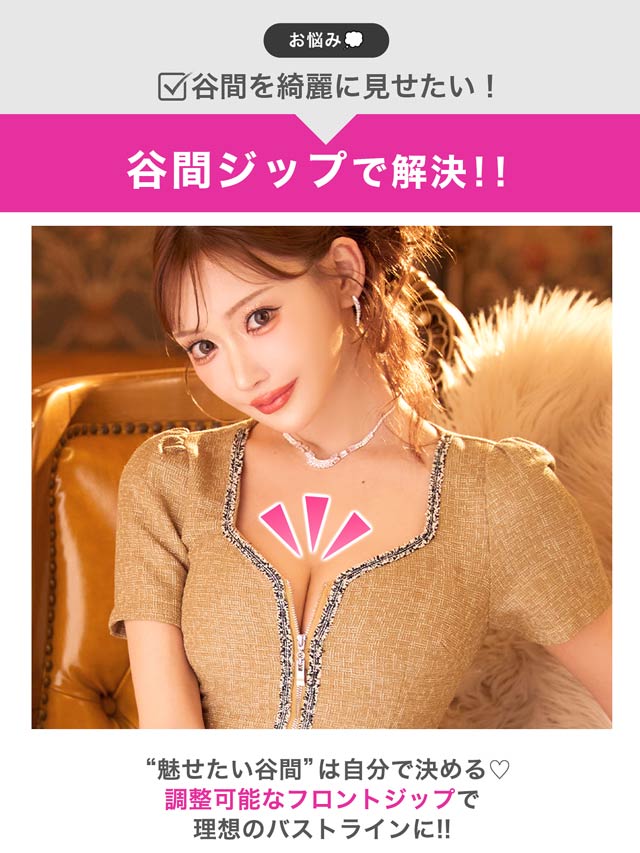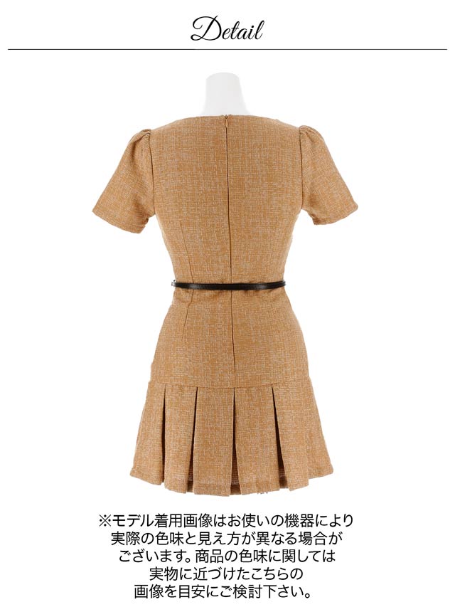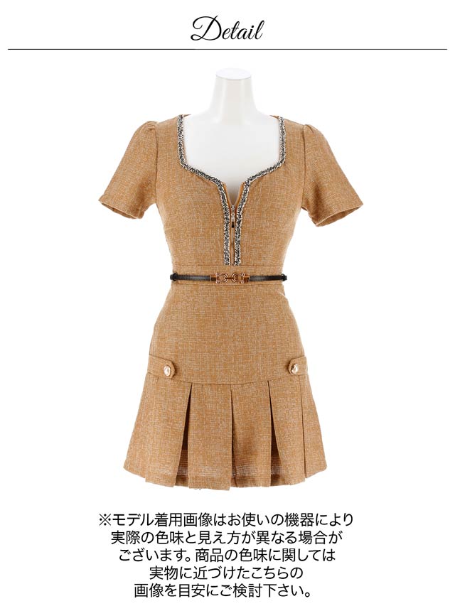 高見え抜群な大人上品カラーのツイードドレス♪胸元のフロントジップは露出を抑えたりセクシーに魅せたりとアレンジ自在!スカートはプリーツ&Aラインシルエットで可愛らしく軽やかな印象に。くびれマークができるベルトが付属しているのも嬉しいポイントです!