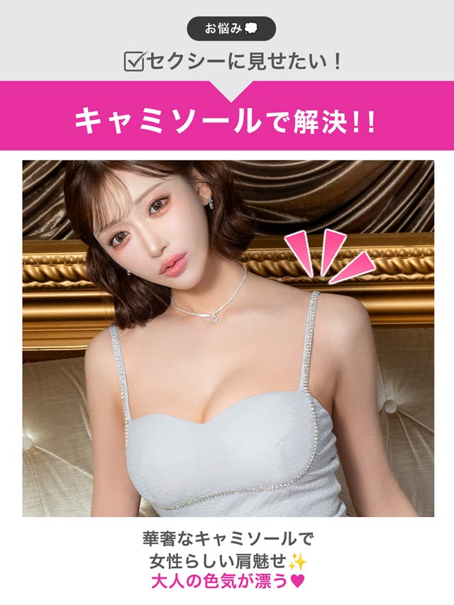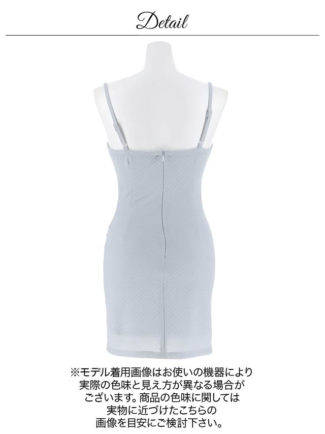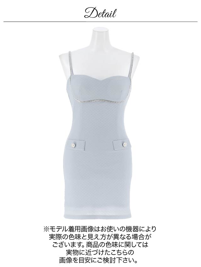 バスト部分から肩紐の煌びやかなビジューラインが視線を集めるミニドレス。バストアップ効果や女性らしい曲線美を際立たせるデザインがセクシーさ溢れる1着◎ ポケットモチーフの大粒なパールビジューで華やかさをプラスしました。