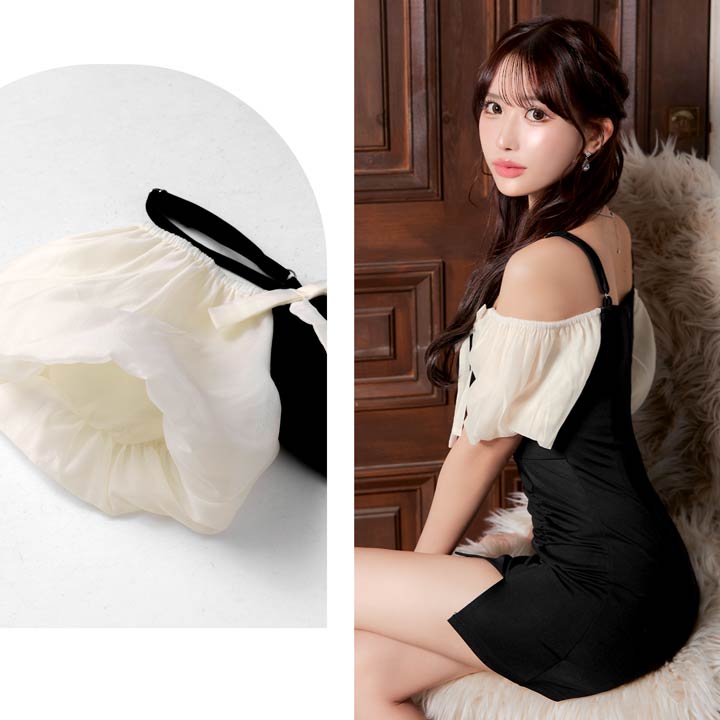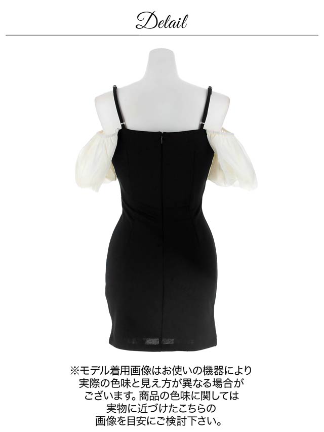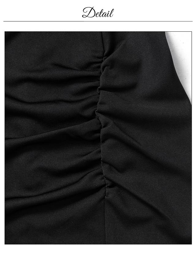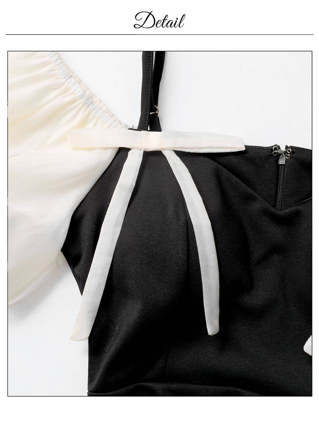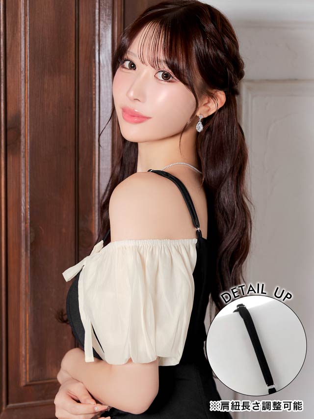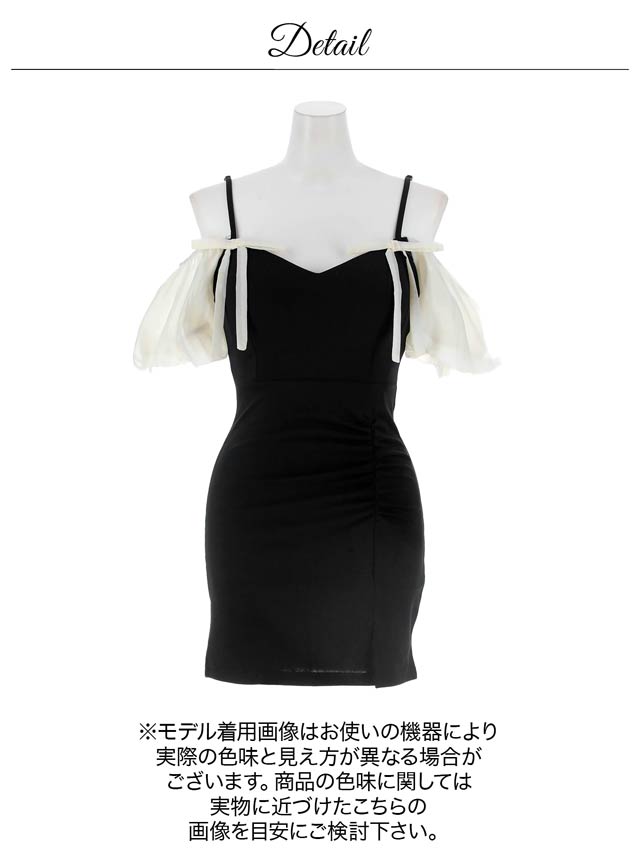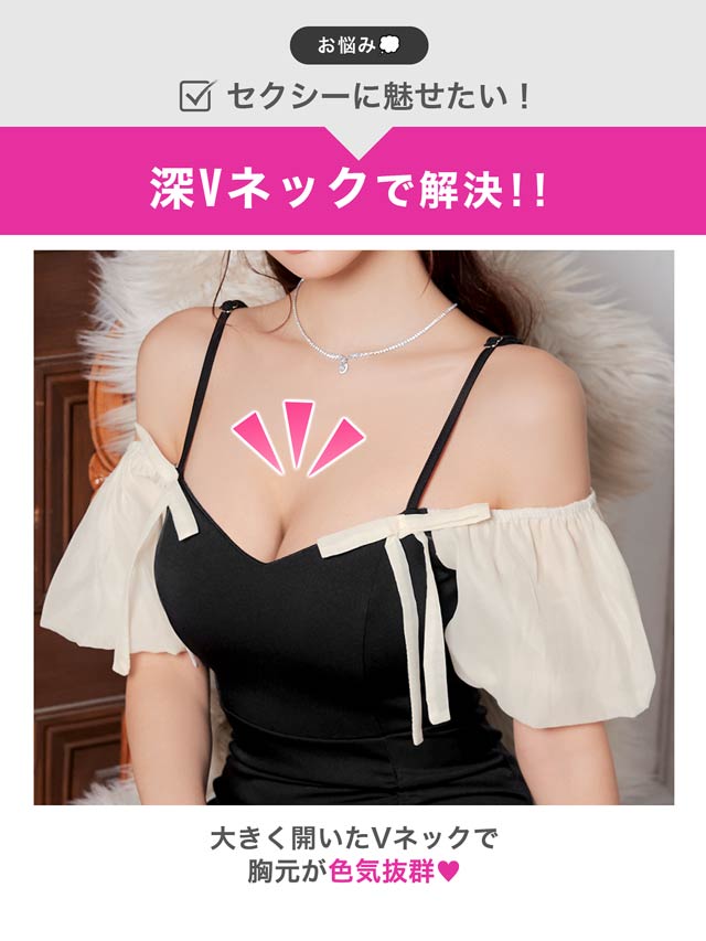 ふんわりとしたオフショルにリボンがアクセントになったキュートなミニドレス。ギャザーを寄せたタイトなシルエットにスリットから覗く太腿もワンポイント◎ 可愛らしさとセクシーさを兼ね備えた1着です♪