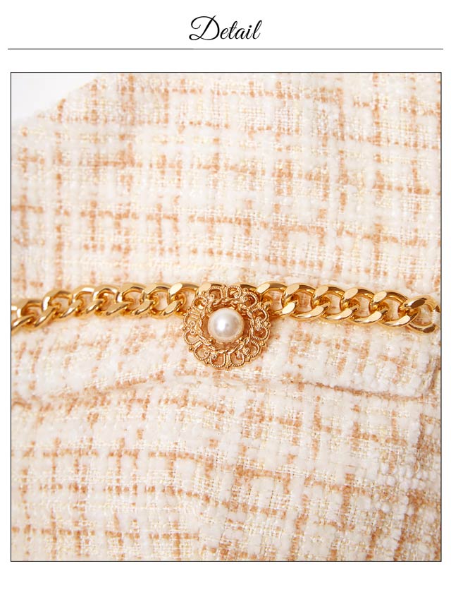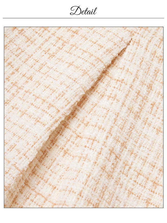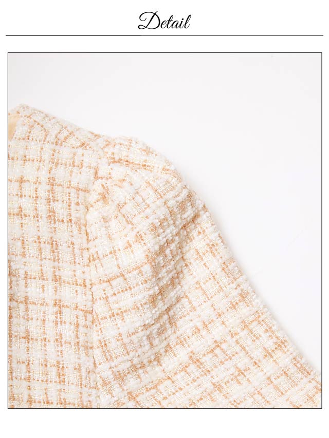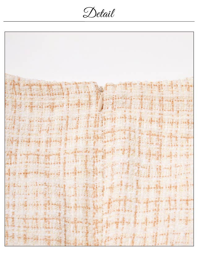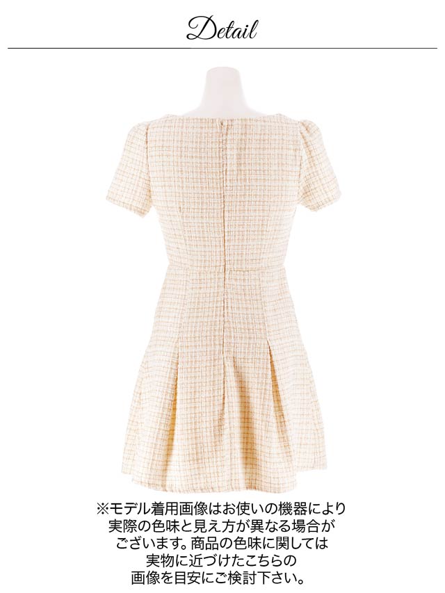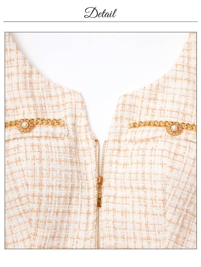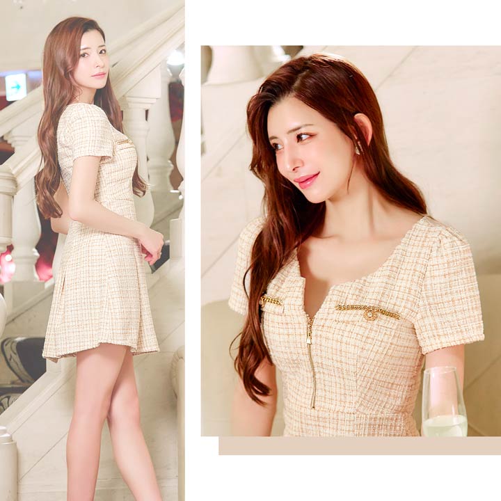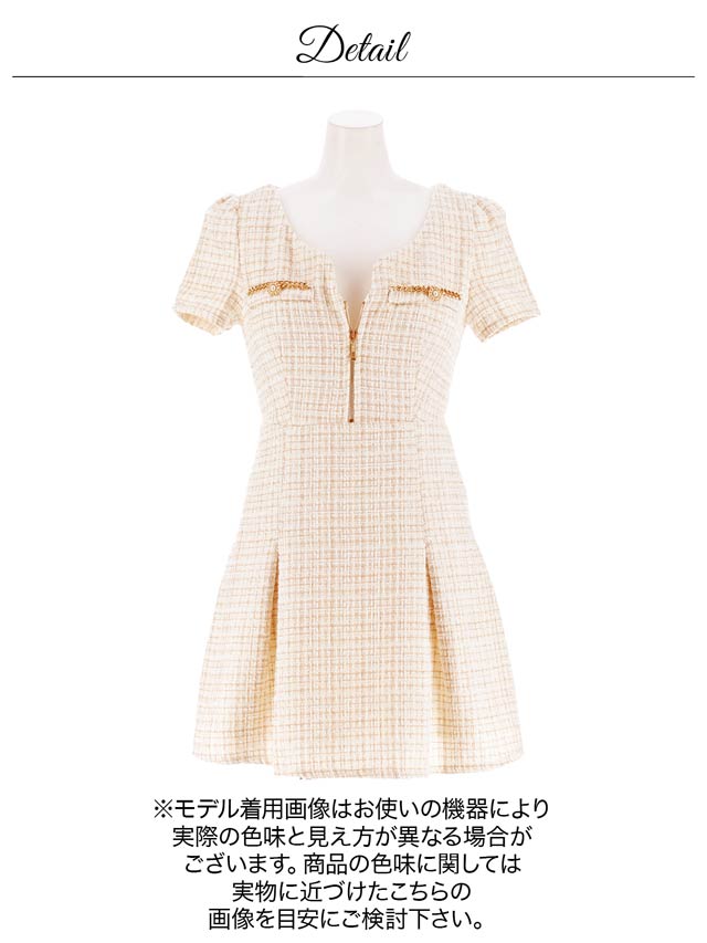 可愛らしいツイードチェック柄に人気のファスナー仕様で色っぽさをプラスしたミニドレス。ポケットモチーフ部分にはキラリと輝くチェーンビジューをあしらい高級感漂う雰囲気に◎ 半袖やフレアシルエットでさり気なく体型カバーをしてくれるのも嬉しいポイントです。