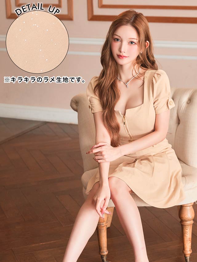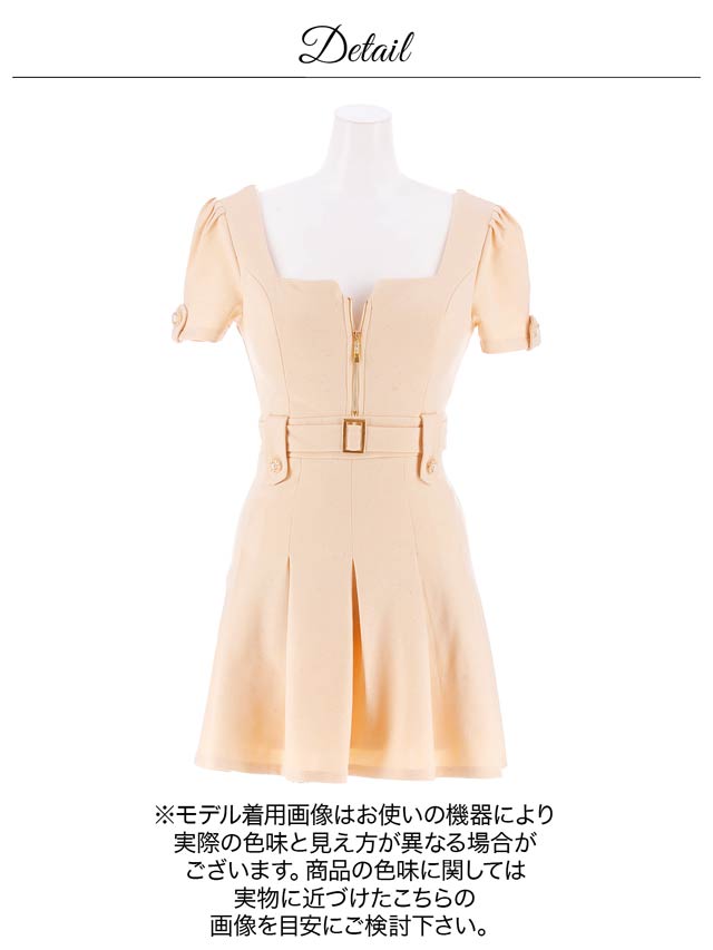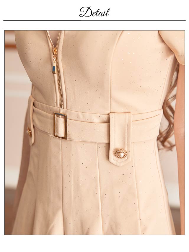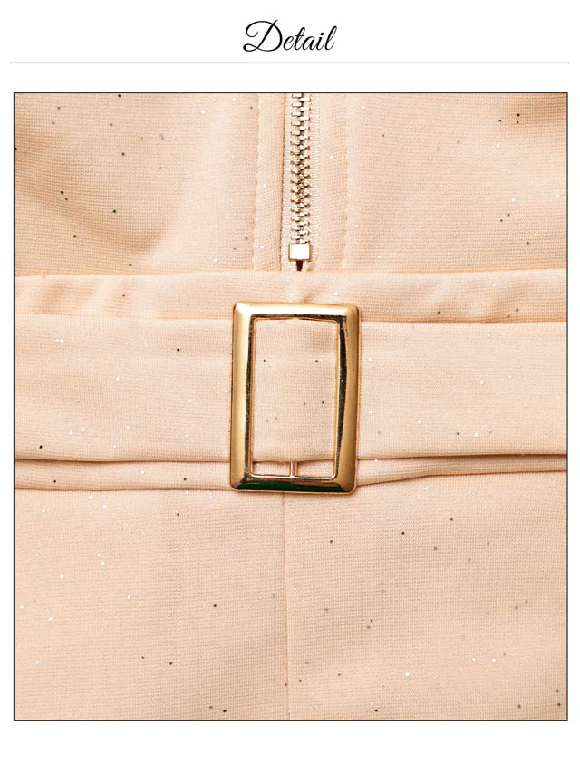 上品な輝き放つグリッター生地に人気のファスナー仕様が華やかなミニドレス。綺麗めカジュアルなベルトモチーフ付きでウエストをしっかりマークします◎ プリーツ加工を施したAラインスカートが程よいフェミニンさを演出します。