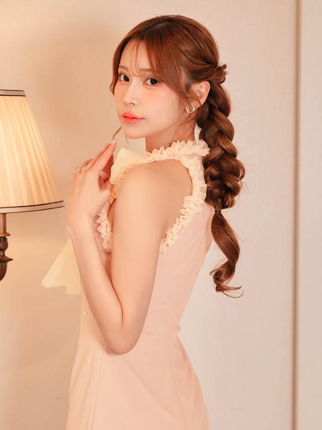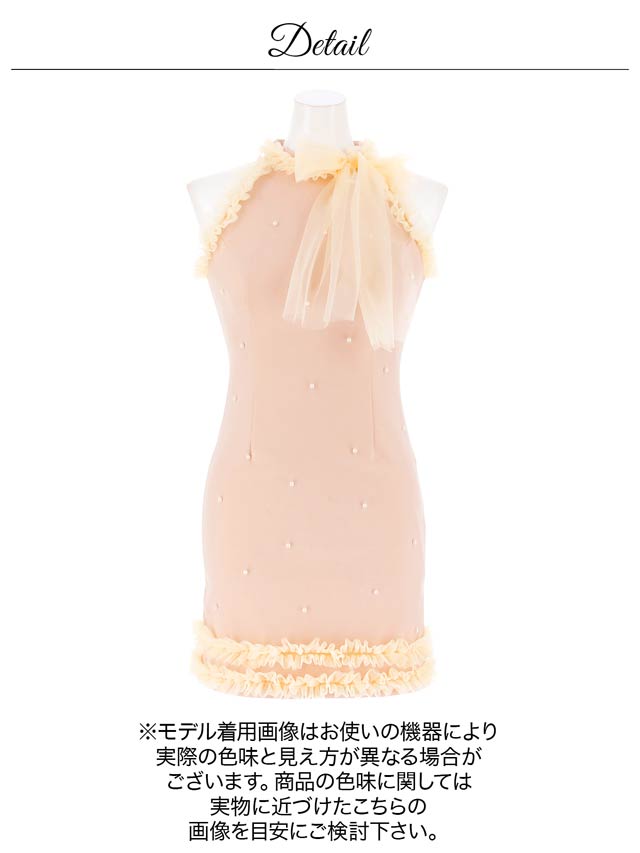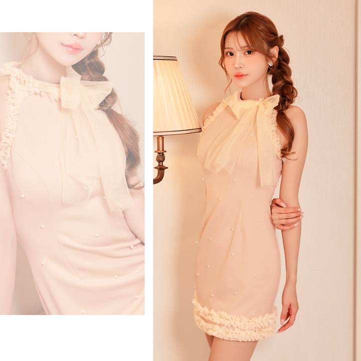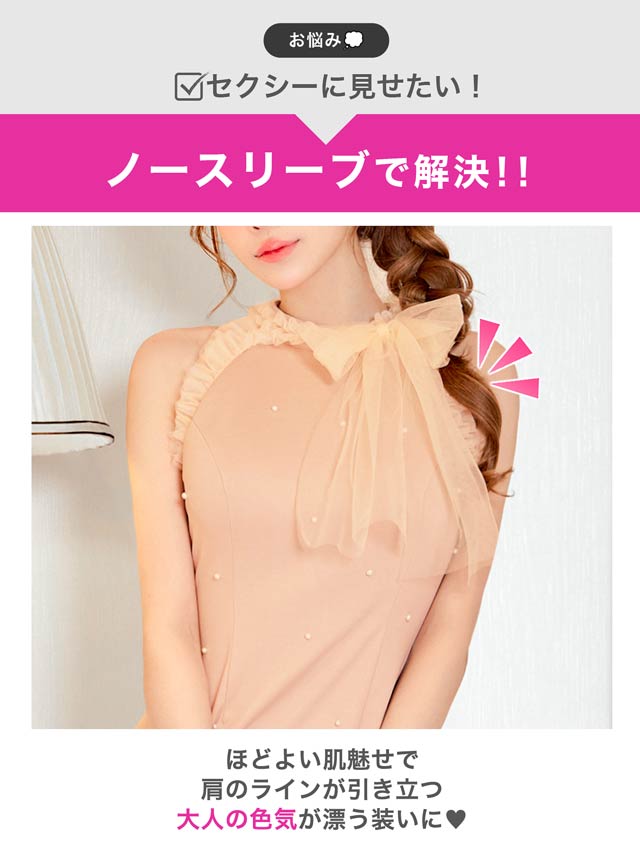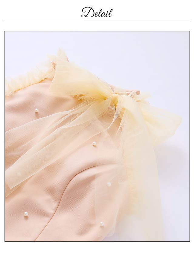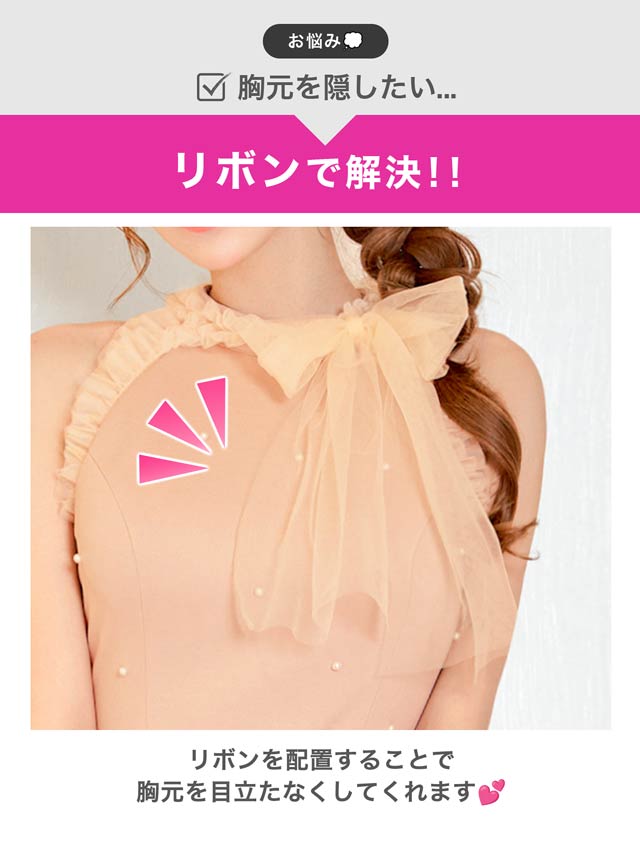大きなチュールリボンが顔まわりを華やかに見せ、小顔効果も期待できるキャバドレス♪散りばめられたパールと裾のフリルが上品さの中にほどよい甘さを添えます。アメスリで程よく肌見せしつつ、胸元を隠せるので露出が苦手な方でも挑戦しやすいデザインです◎