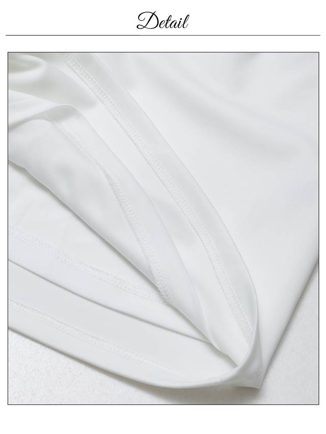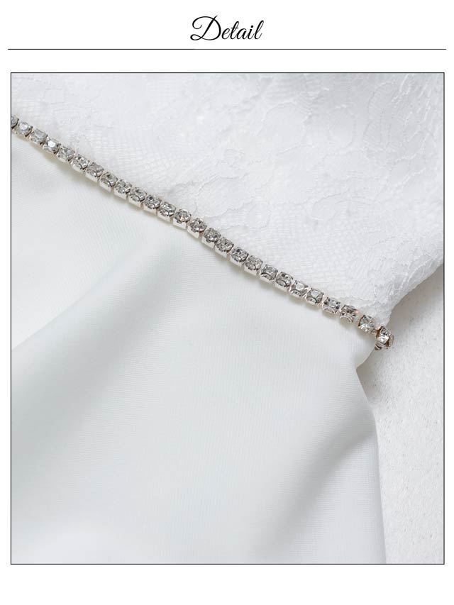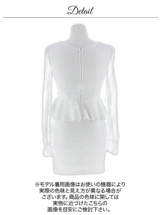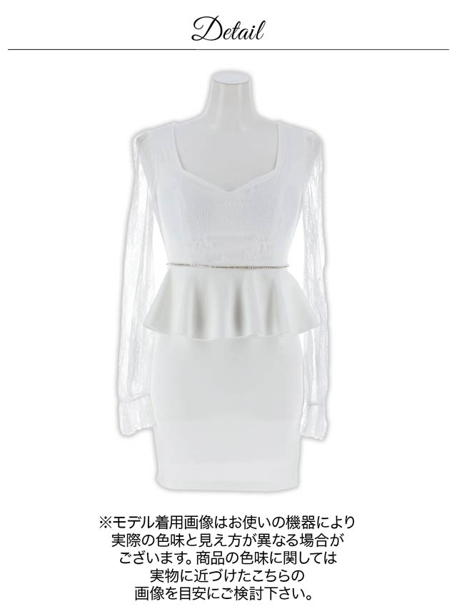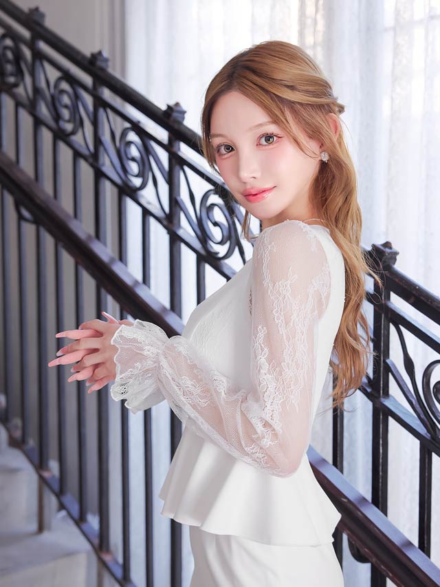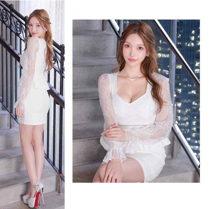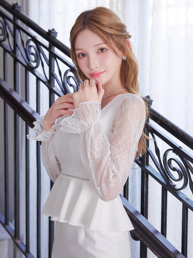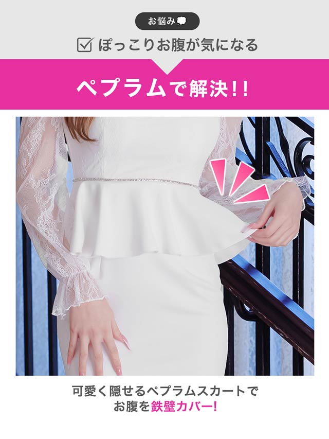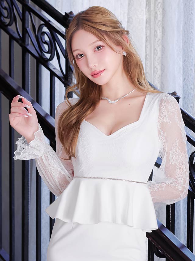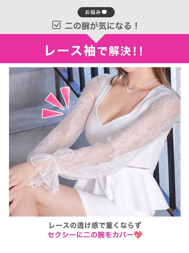 身にまとうだけで清楚で上品な印象を与えるホワイトカラーのキャバドレス。ウエストにきらめくビジューとペプラムが自然なメリハリを生み、スタイルアップ効果も抜群◎透け感のあるレース袖が女性らしさをプラスしつつ二の腕をカバーしてくれるのも嬉しいポイントです!