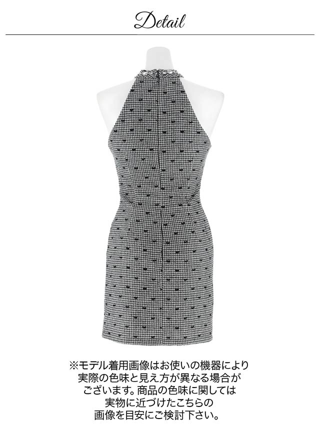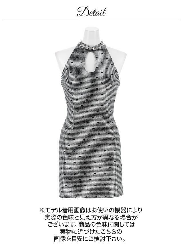 甘さと大人っぽさを兼ね備えた千鳥格子×リボン柄が目を惹くキャバドレス。谷間をさりげなく覗かせるカットアウトや、肩ラインを強調するアメスリデザインで色っぽい肌見せを演出♪ネックラインに輝くビジューが顔まわりを華やかに見せ、存在感をUPしてくれるのもポイントです!