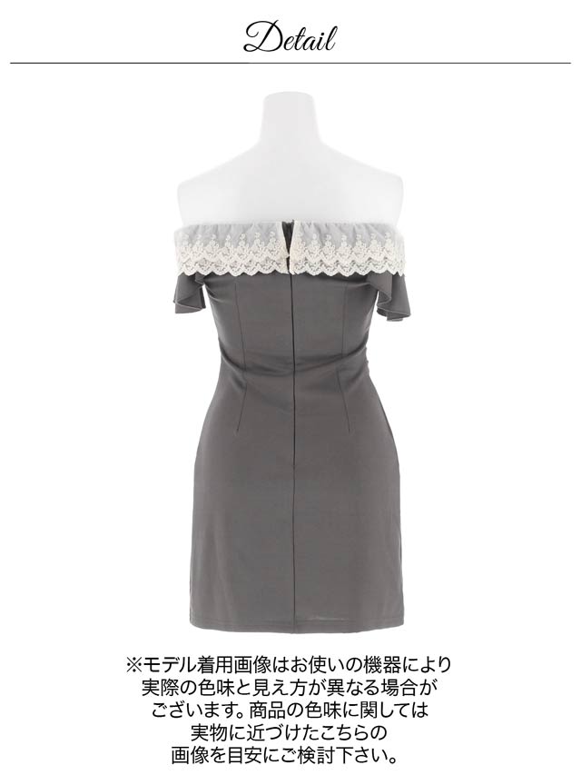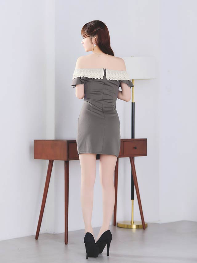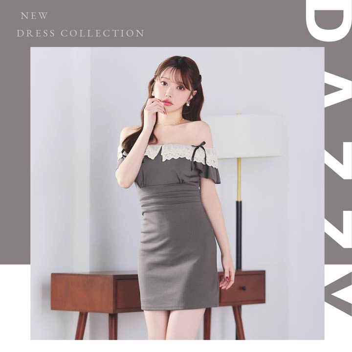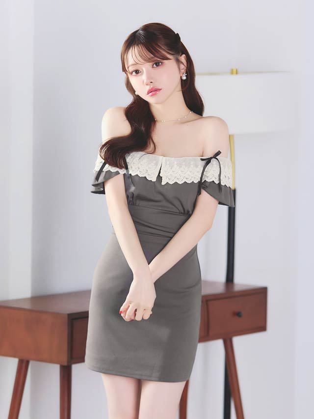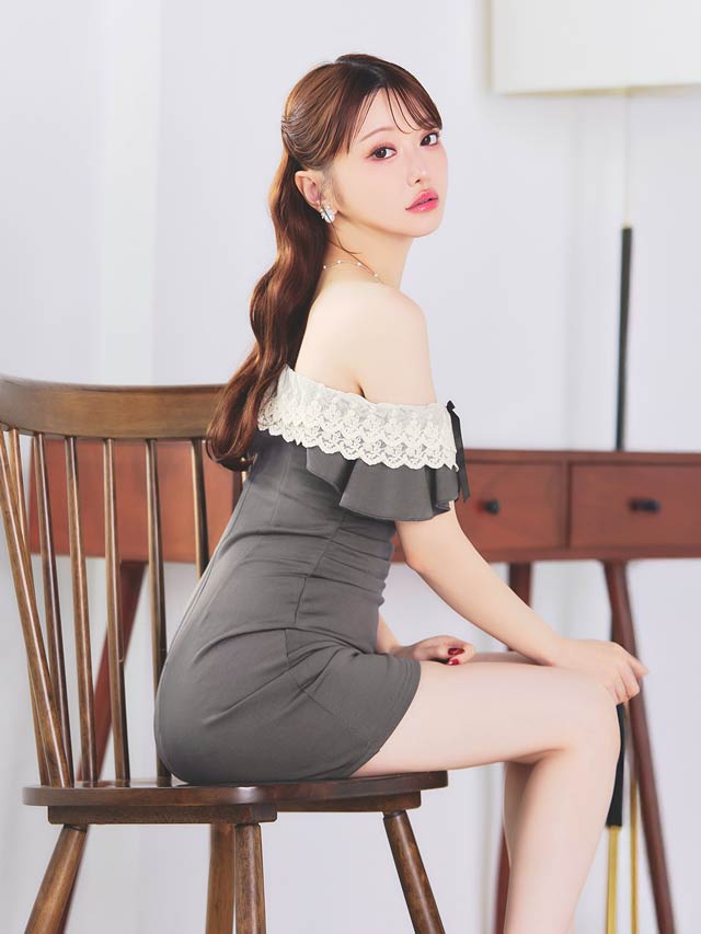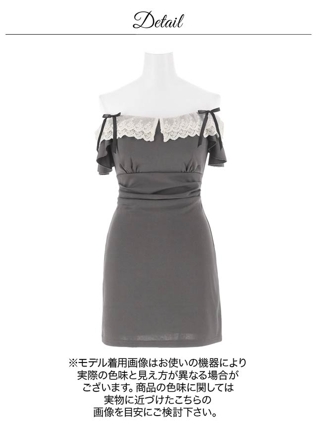 4/6新作!デコルテ魅せオフショル×二の腕隠し♪肩リボンフリルレースのタイトミニ丈キャバドレス[SML/3サイズ展開]
