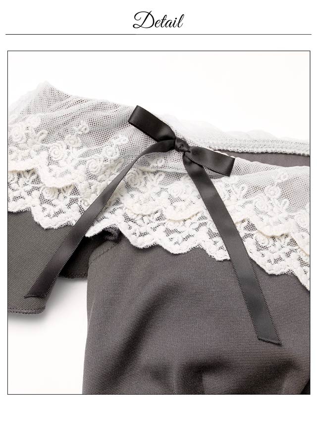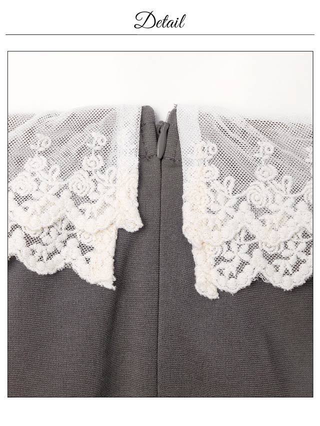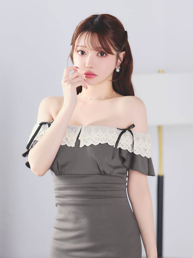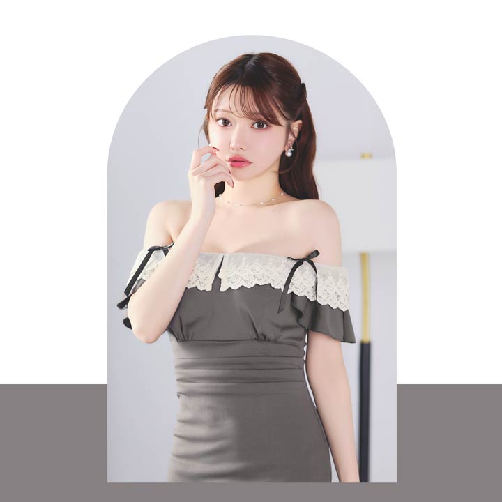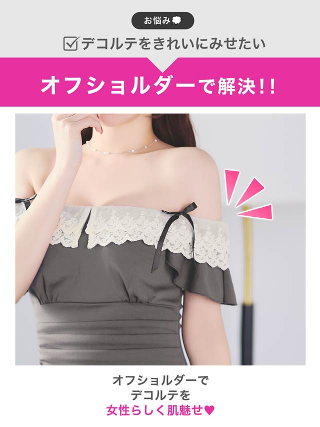 フリルレースをあしらったデコルテが上品さとこなれ感を漂わせるキャバドレス。オフショルに加え、肩のリボンディテールがさりげない甘さと華奢見えを演出します。二の腕周りをカバーしてくれるのも嬉しいポイントです。