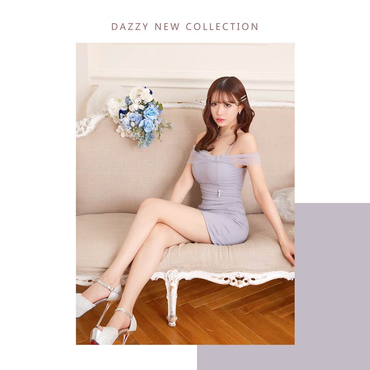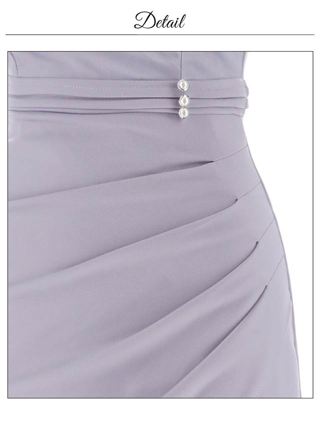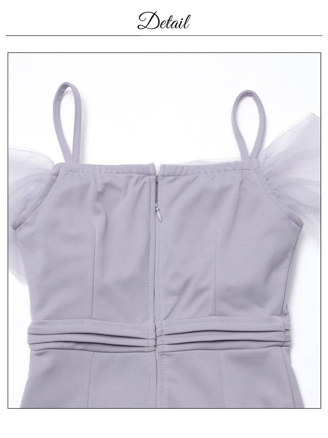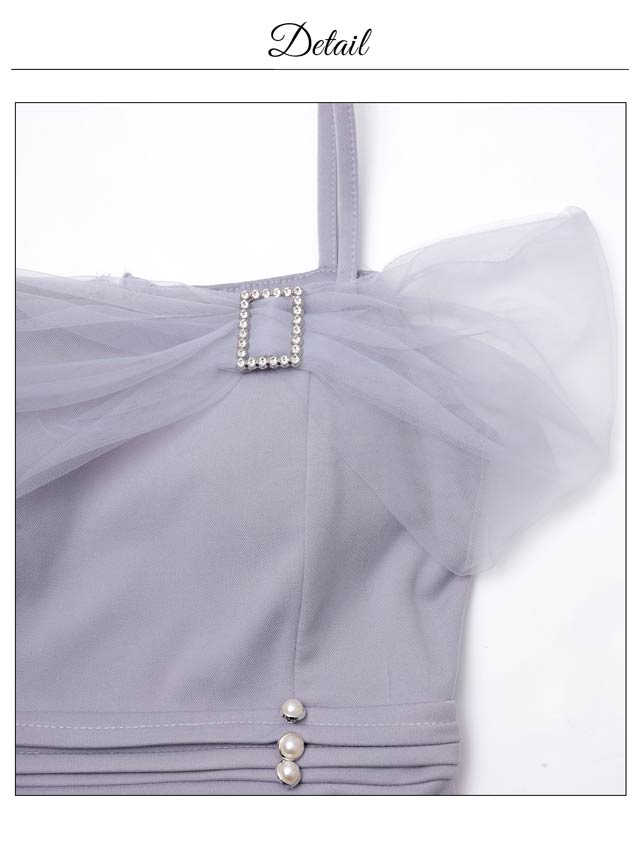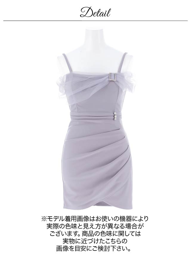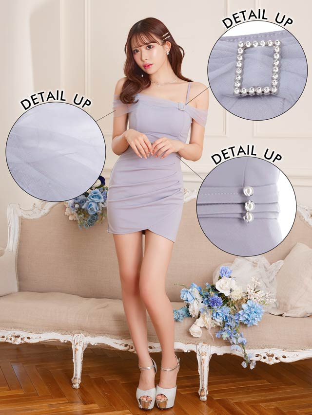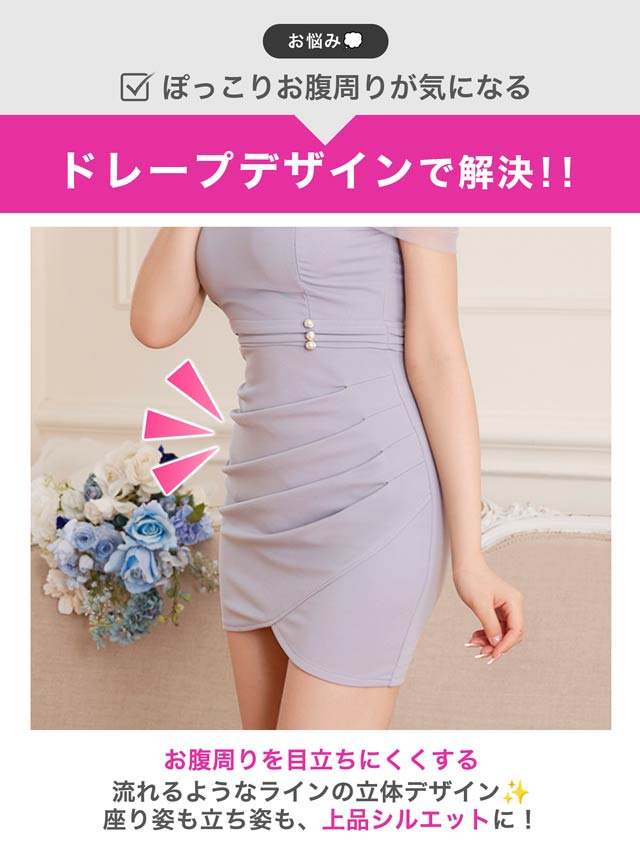チュール袖をあしらったオフショルデザインでデコルテを美しく演出するキャバドレス。きらめくビジューバックルやパールボタンが華やかさを添えてくれます♪ウエストのギャザーが自然な立体感を生み、細見え効果も期待できる一着です!
