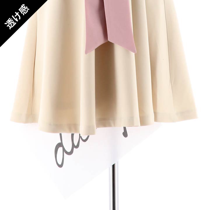 オトナなベージュからーとピンクのフラワー刺繍がキュートなミニドレス。ベージュ×ピンクの色合いが可愛らしい女の子を演出♪リボンベルト付きで気になるお腹も細見せできちゃう◎