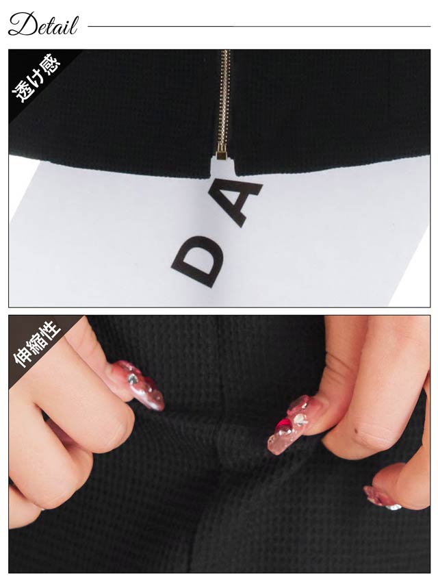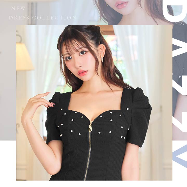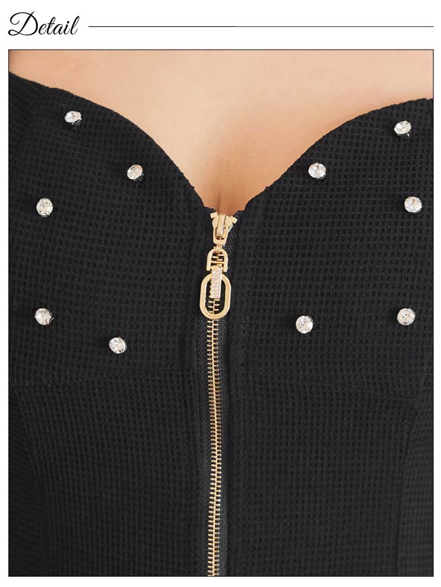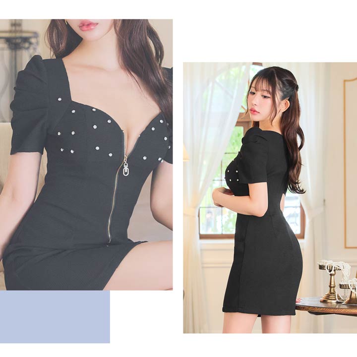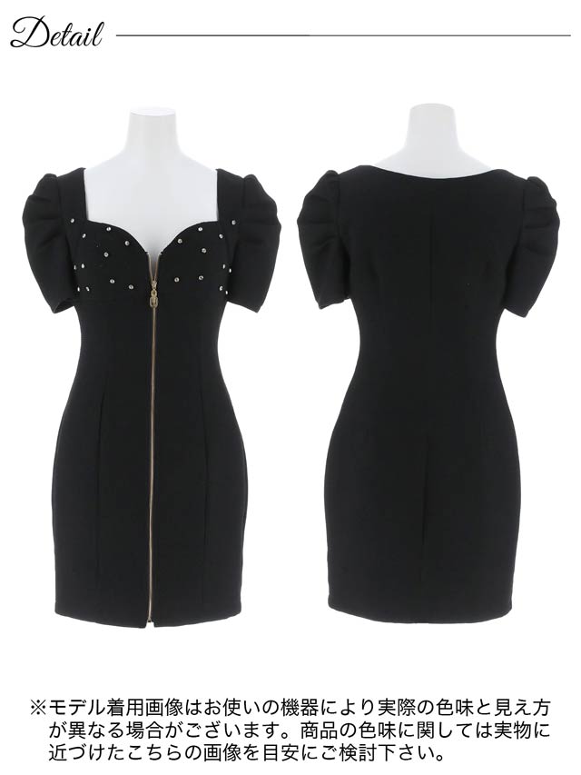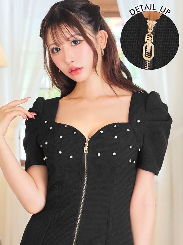 キラリと輝くラインストーンがデコルテを華やかに演出するミニドレス。谷間の魅せ方を変えられるフルジップ仕様で大人セクシーな印象を与えます◎ 肩幅を華奢魅せしてくれるパフスリーブもワンポイントになった1着です。