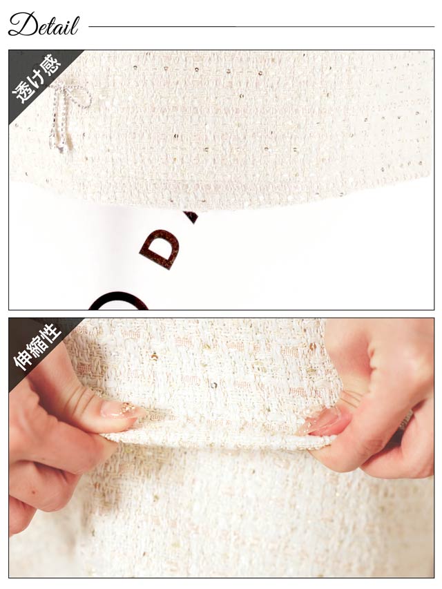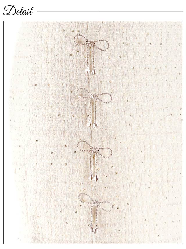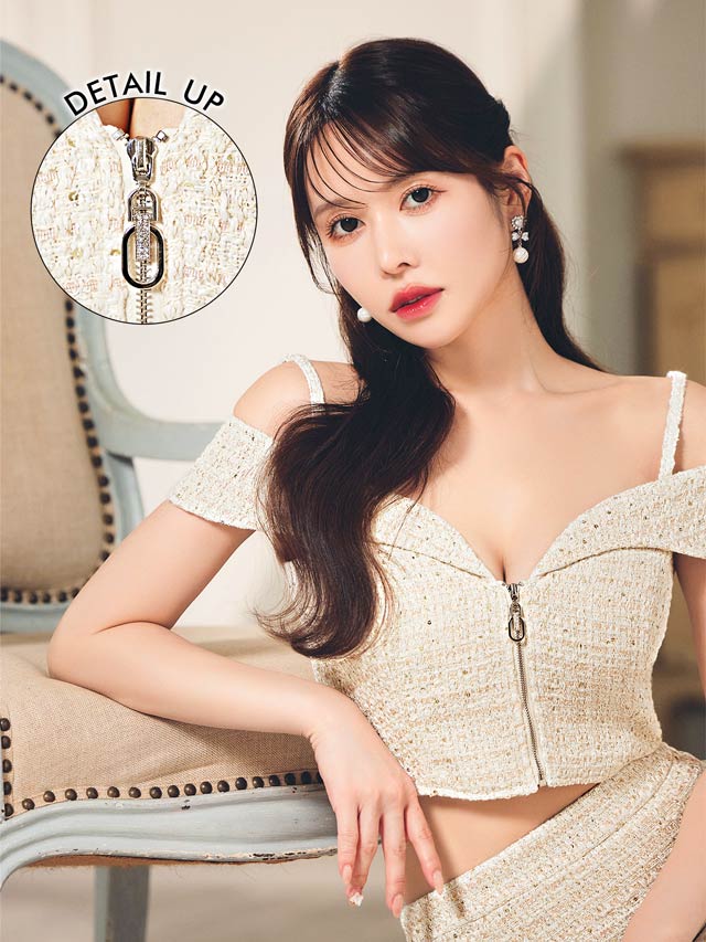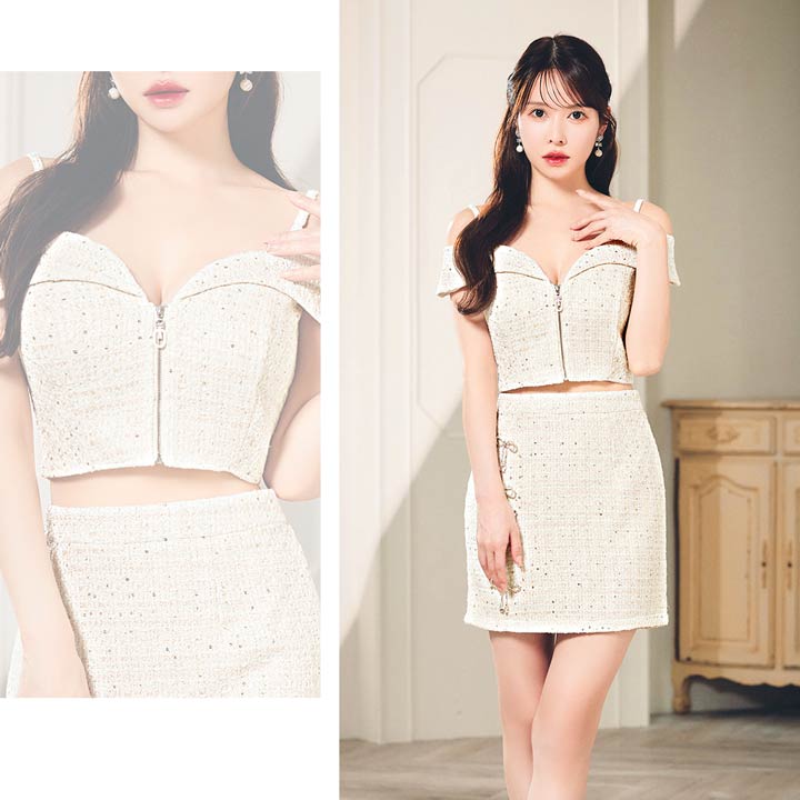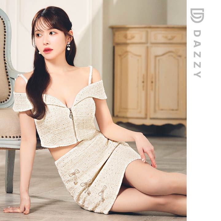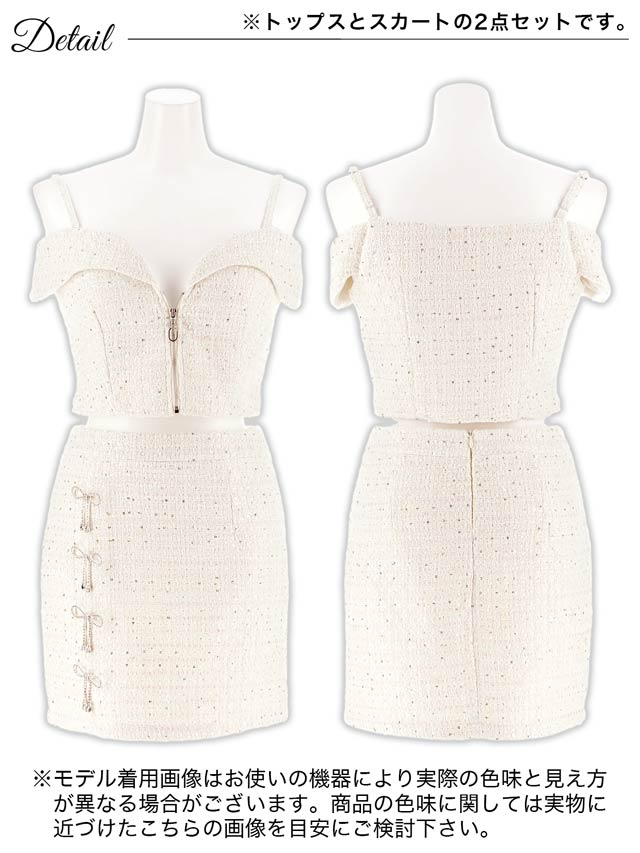キラリと輝くリボンビジューがアクセントになったミニドレス。上品なツイード生地に人気のフロントジップ仕様でトレンド感のある谷間魅せを演出します◎ チラッと見えるウエストや着脱が楽ちんなのはセットアップならではのポイントです♪