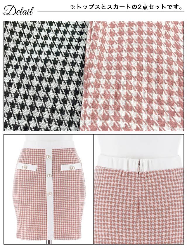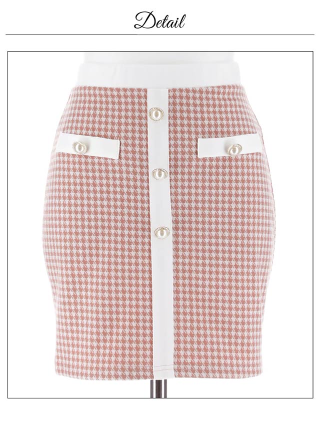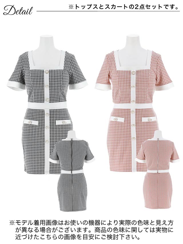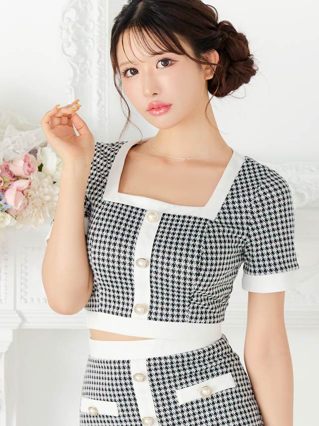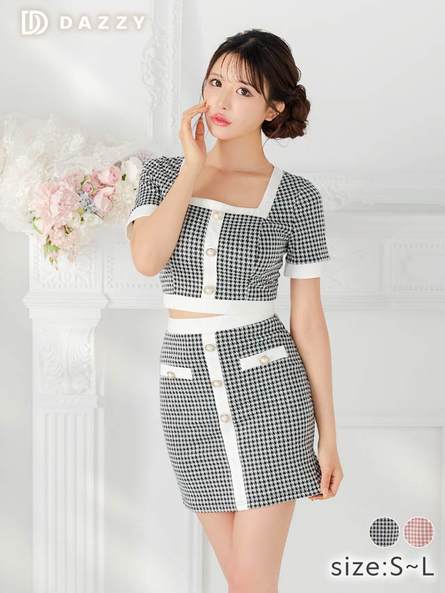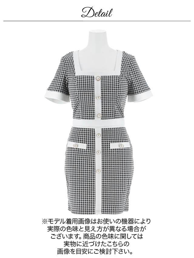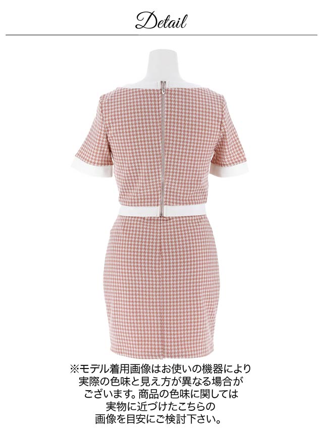 大人かわいい千鳥格子柄にホワイトのフロントラインでメリハリを効かせたミニドレス。中央にあしらわれた大粒なパールビジューが女性らしい上品さをプラスします◎ セットアップならではのウエストのチラ見えもワンポイントです♪