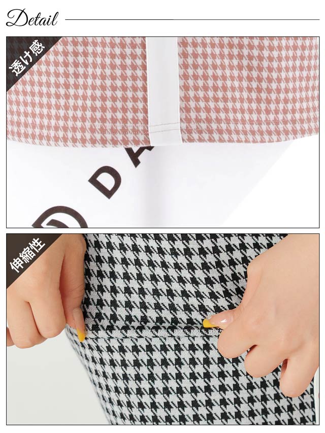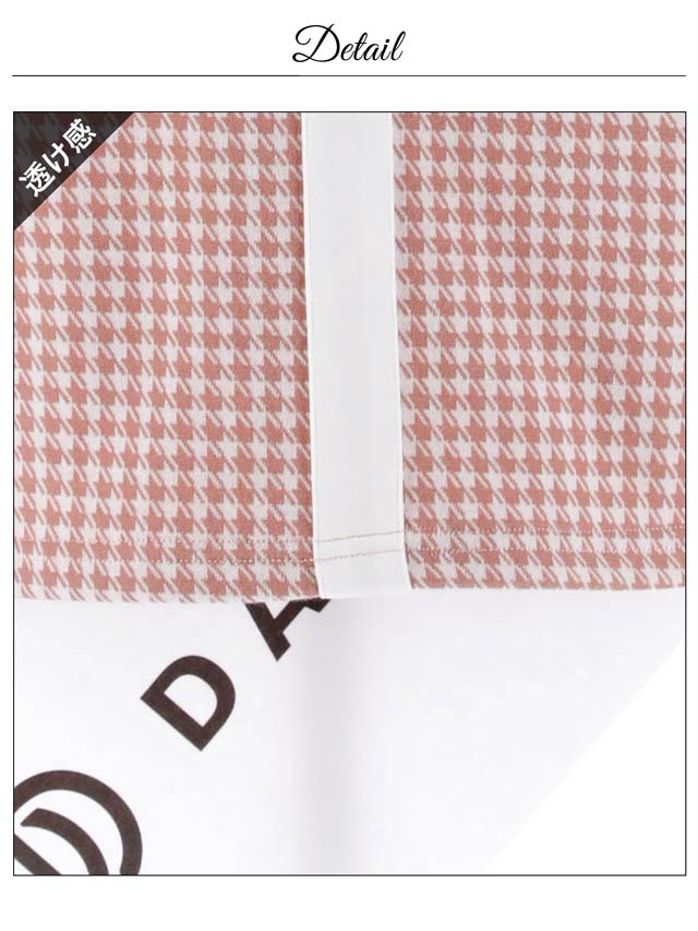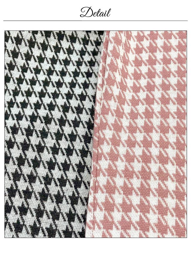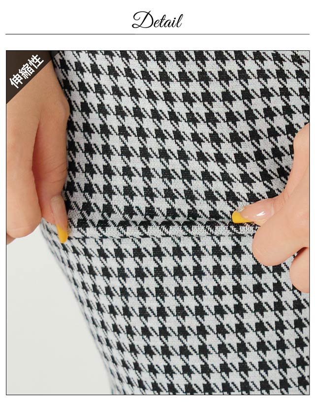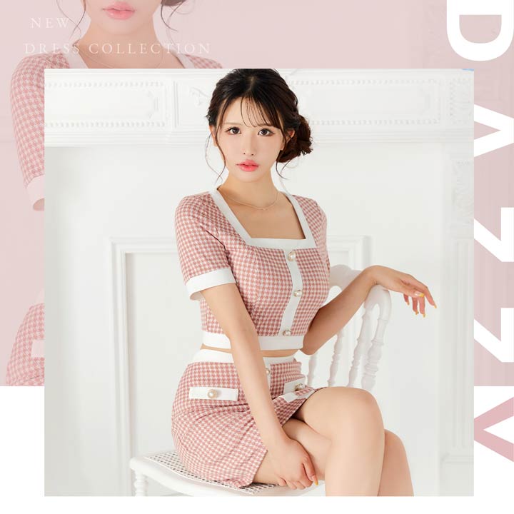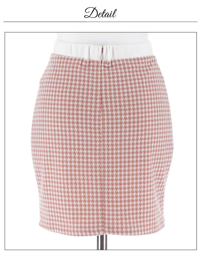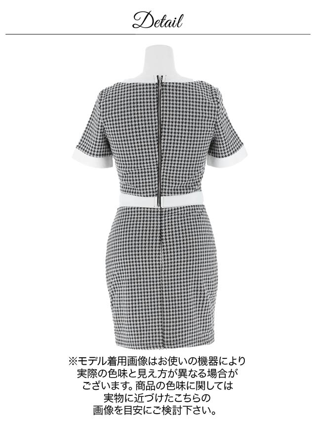大人かわいい千鳥格子柄にホワイトのフロントラインでメリハリを効かせたミニドレス。中央にあしらわれた大粒なパールビジューが女性らしい上品さをプラスします◎ セットアップならではのウエストのチラ見えもワンポイントです♪