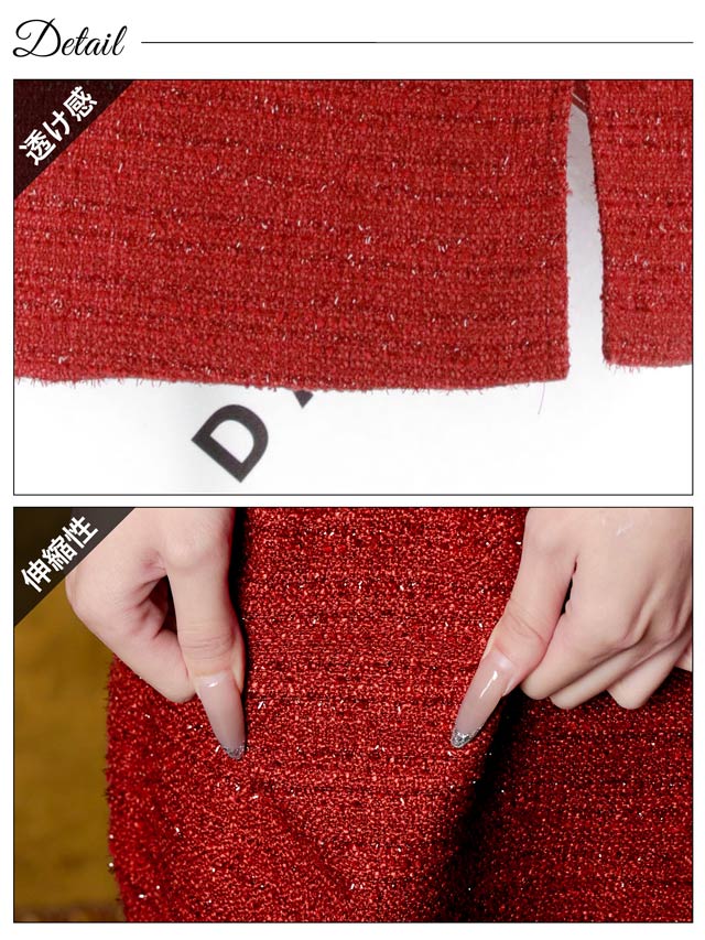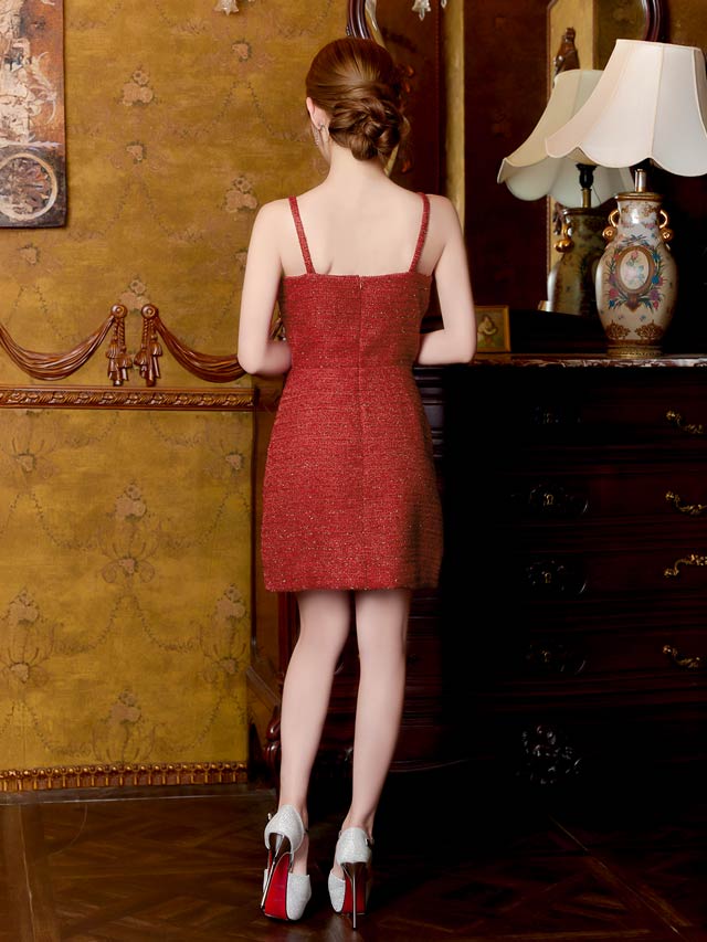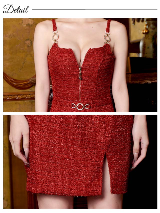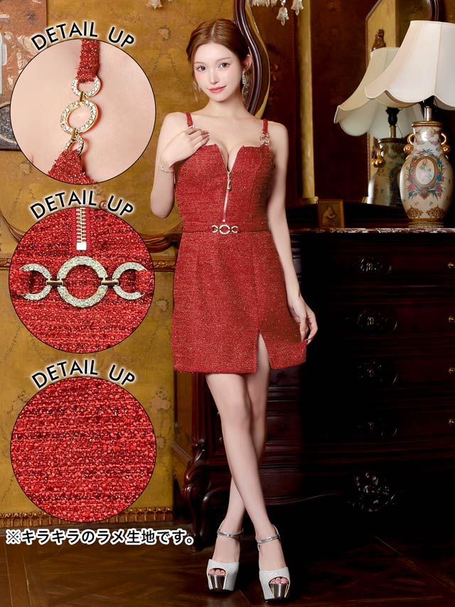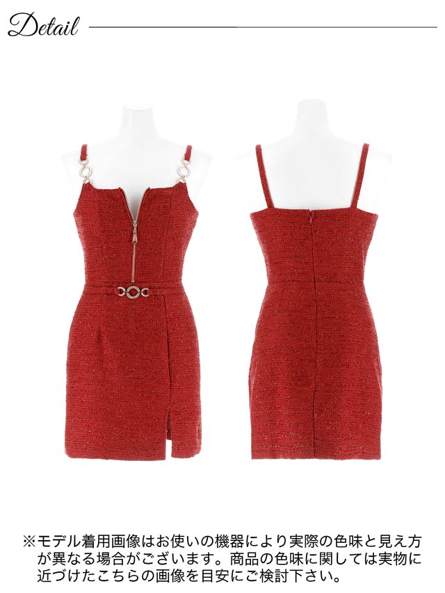 深みのあるツイード素材にフロントジップでお好みの谷間魅せが叶うミニドレス。高級感漂うゴールド金具を肩紐とベルトモチーフにあしらい女性らしいシルエットを引き立たせます◎ スリットからチラッと見える太腿もワンポイントな1着です!