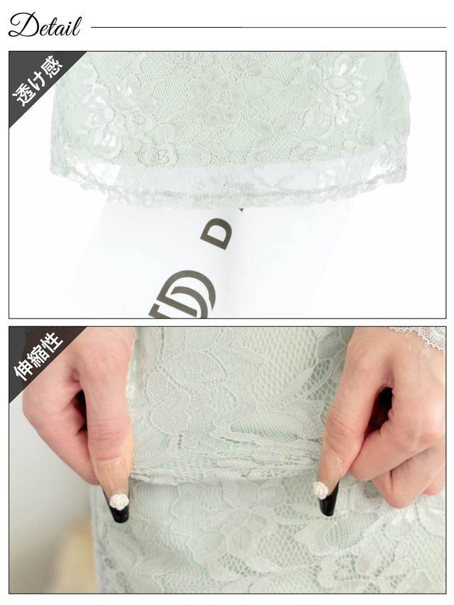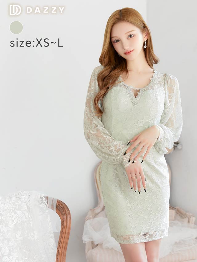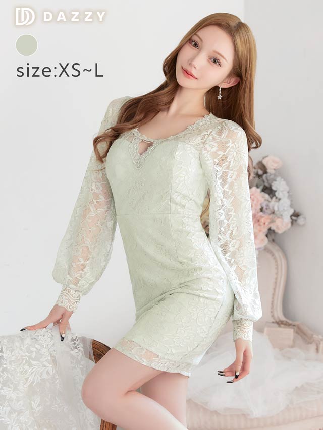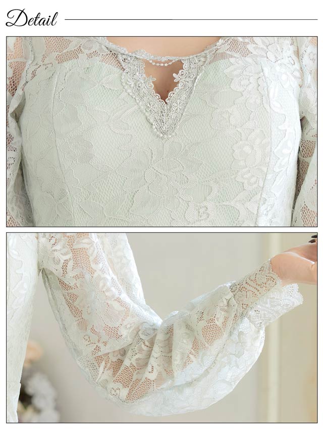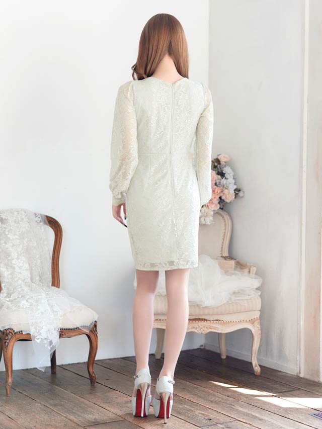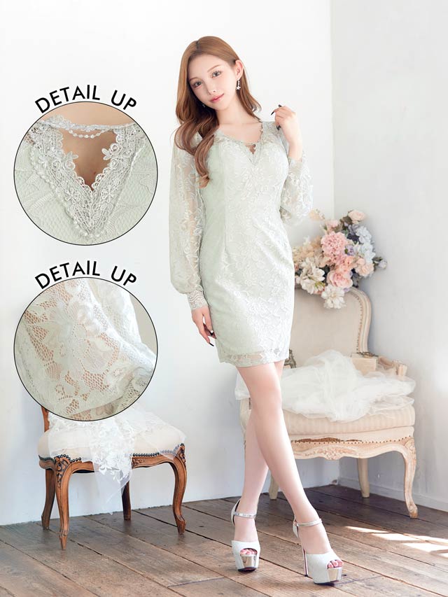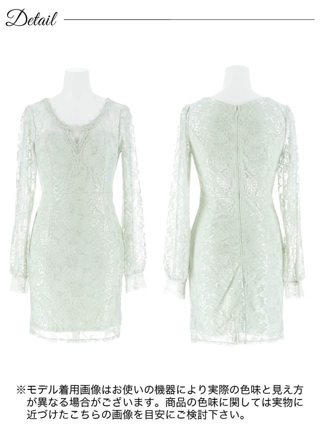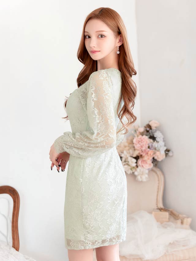 やわらかくフェミニンな印象を与えてくれる淡いミントカラーのタイトミニドレス。谷間がちらりと覗くVネックデザインがほんのり色っぽく、お顔まわりもすっきり見せてくれます◎華やかなレーススリーブで気になる二の腕もふんわりカバーできちゃう優秀ドレスです♪