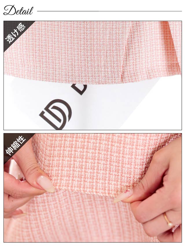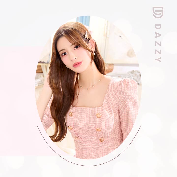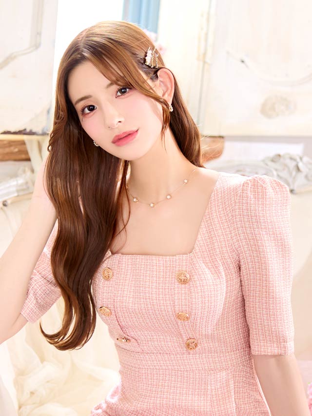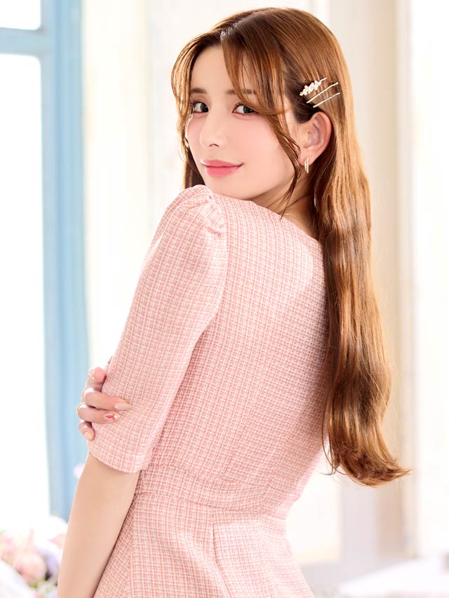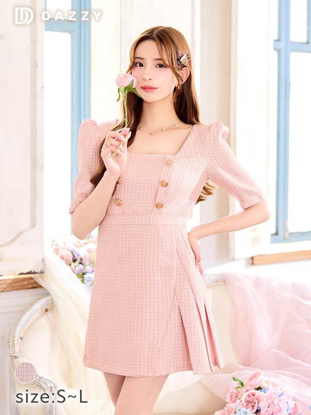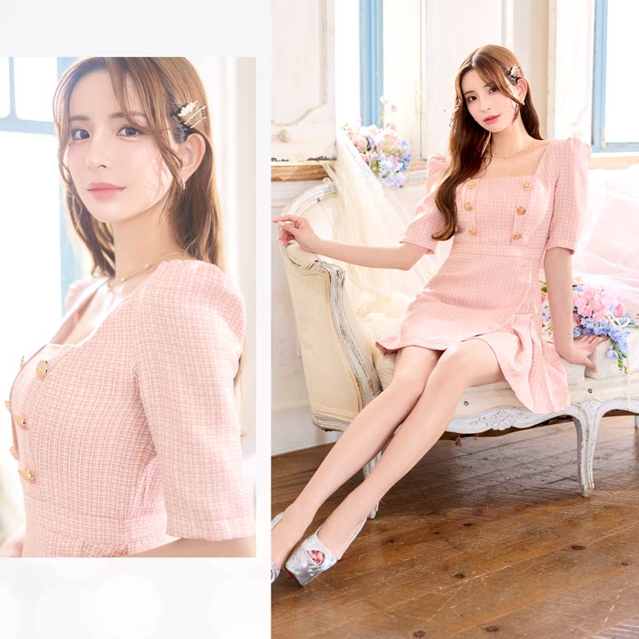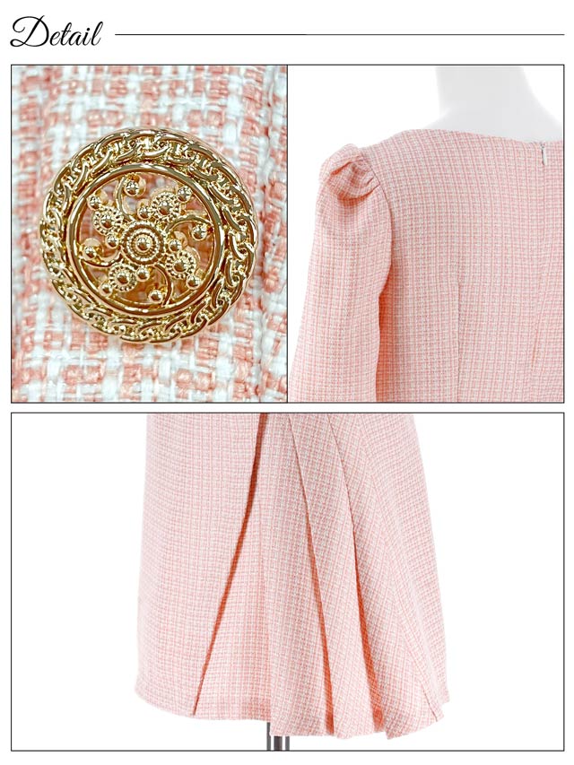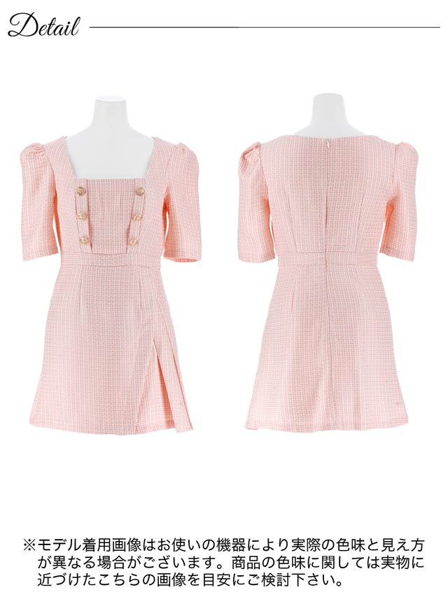 ピンクカラーの上品ツイードにゴールドボタンがアクセントになった大人フェミニンなミニドレス。程よい深さのスクエアネックがデコルテをキレイに見せ、小顔効果も期待できます◎サイドプリーツが可愛らしいAラインのスカートで下半身を自然にカバーできるのも魅力的です♪