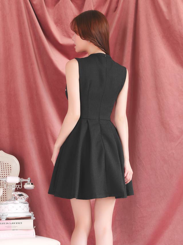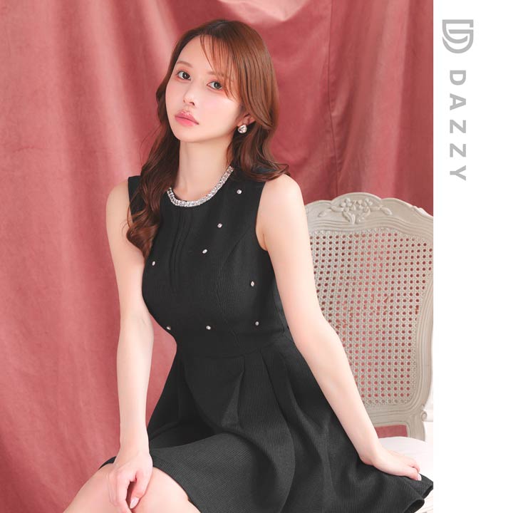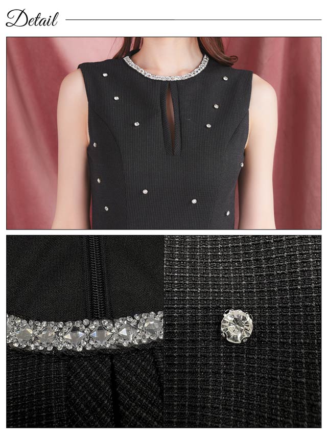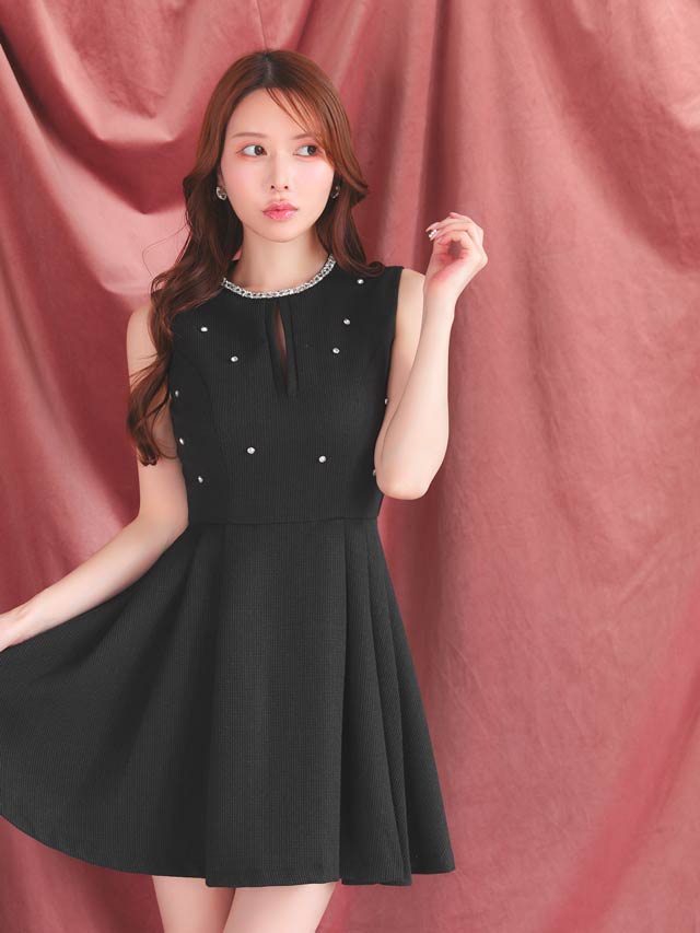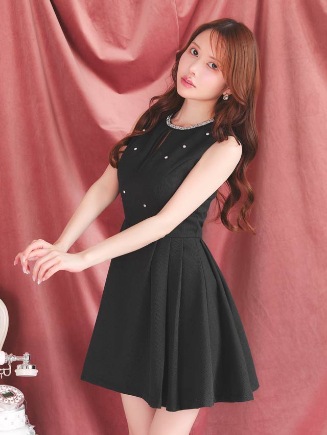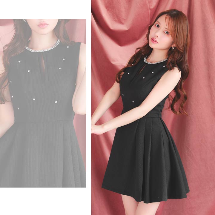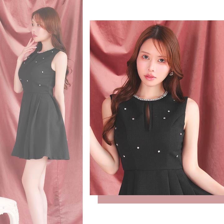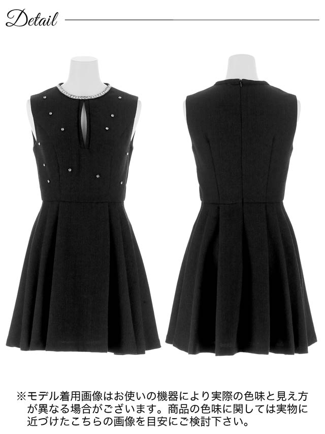 顔まわりを華やかに彩るビジューをあしらい、シンプルながらも存在感を放つミニドレス。ノースリーブ×控えめな胸元のスリットでさりげなく肌見せして女性らしい色気を演出!ふんわり広がるAラインスカートが気になる下半身をカバーしスタイルアップを叶えてくれるのも嬉しいポイントです♪