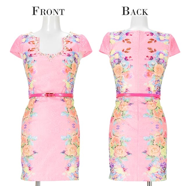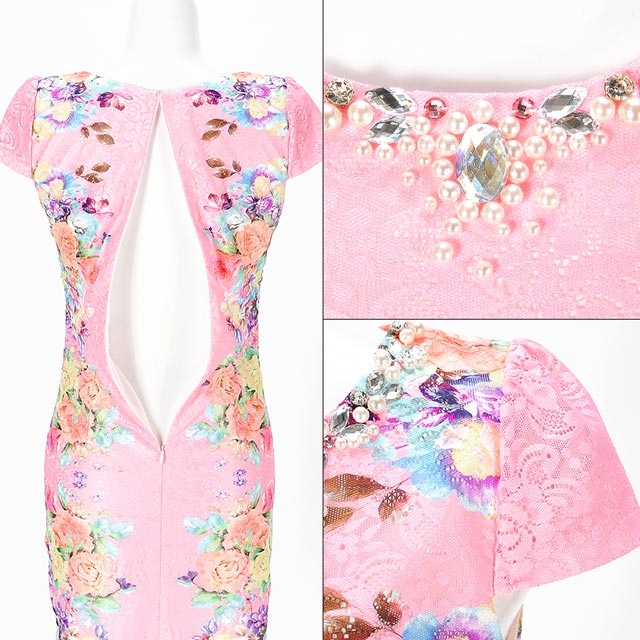 ピンクと花柄の総レースが可愛らしい袖付きタイトミニドレス♪