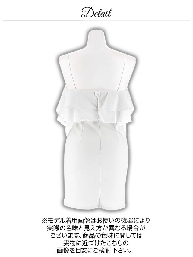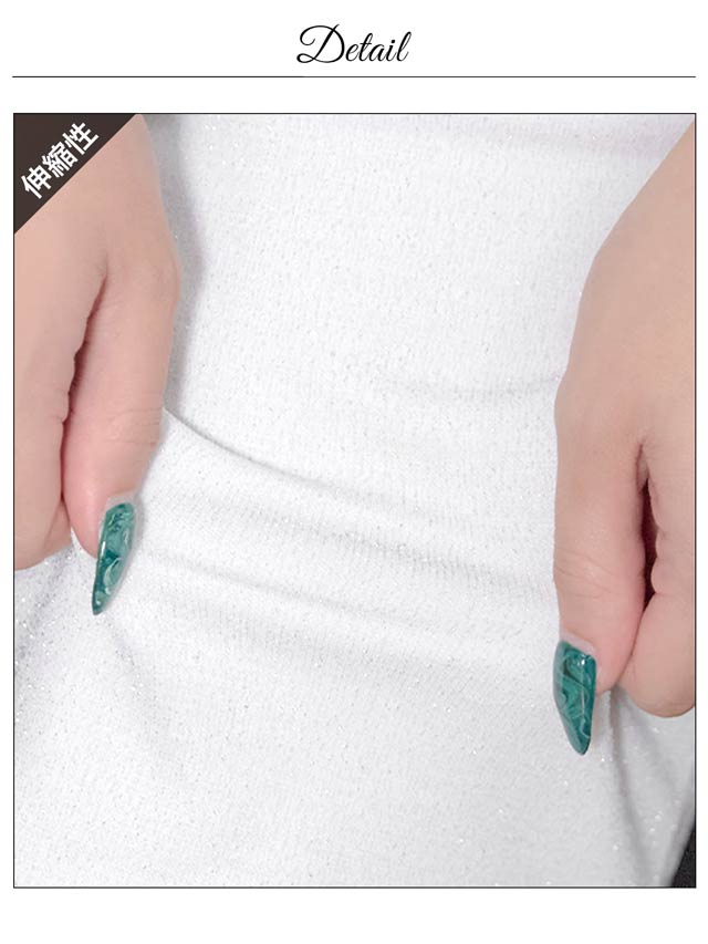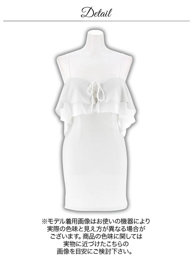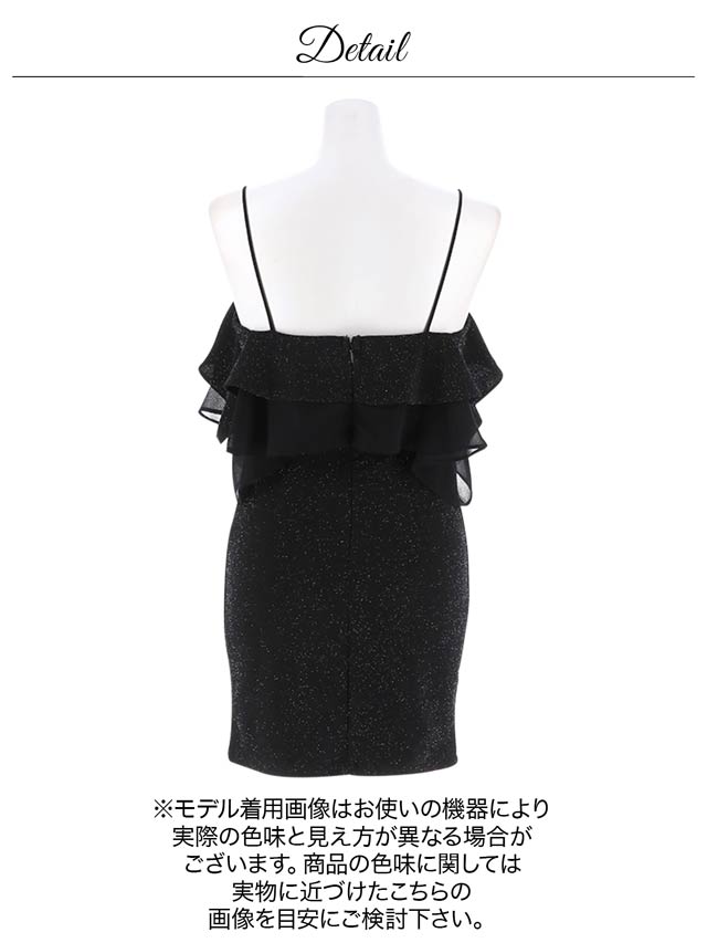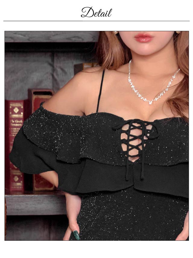 煌びやかなラメ生地に谷間のレースアップが色気漂うミニドレス。胸元からオフショル袖部分にふんわりとしたフレアラインを重ね女性らしい印象に◎ 大胆なキャミソールで華奢な肩見せがしっかり出来る1着です♪