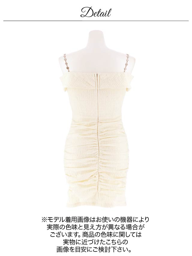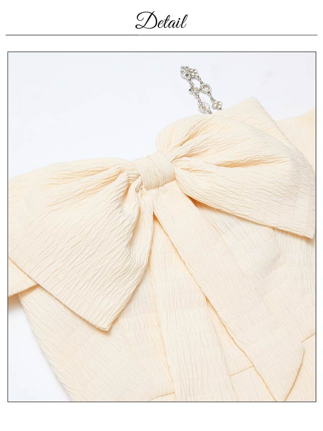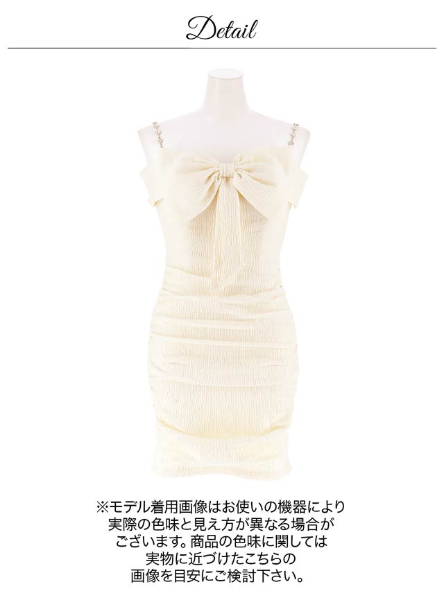 大きなリボンモチーフがアクセントになったフェミニンな印象のキャバドレス。デコルテを美しく見せるオフショルデザインに、きらめくビジューの肩チェーンで華やかさをプラス♪ギャザーを寄せた生地がボディラインを程よくカバーしながら女性らしいシルエットを演出します◎