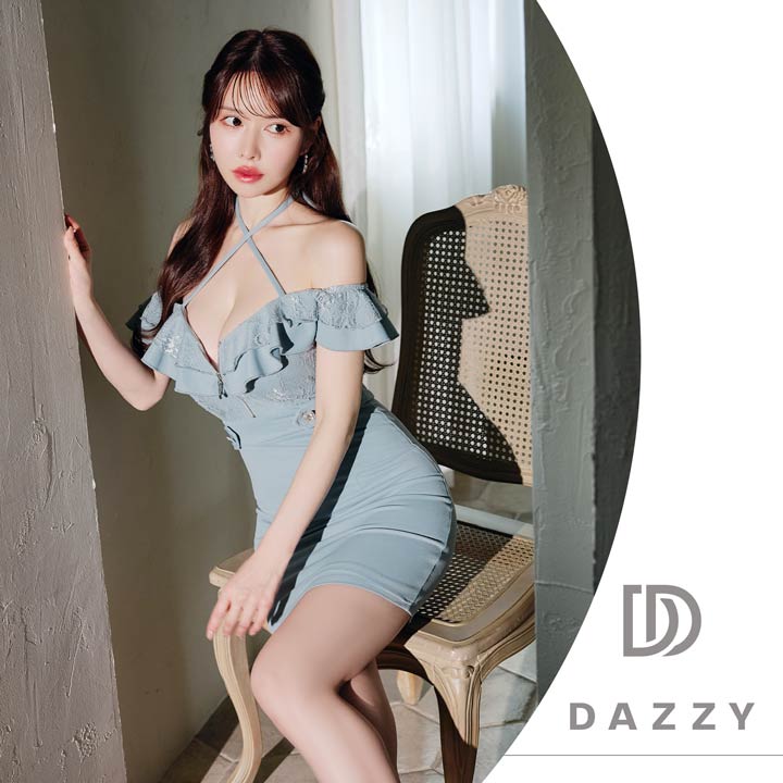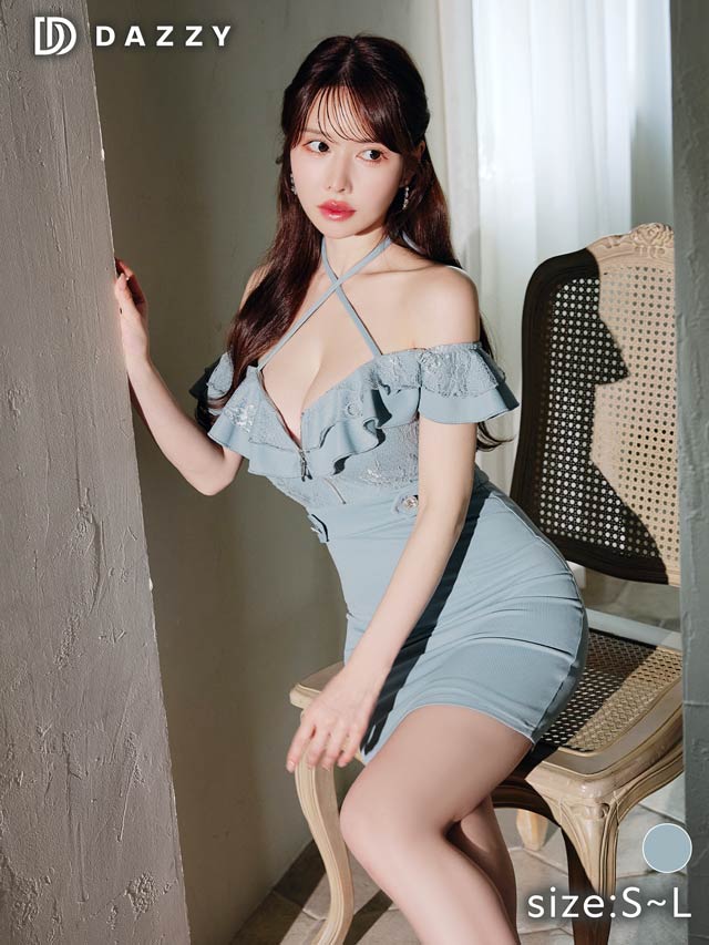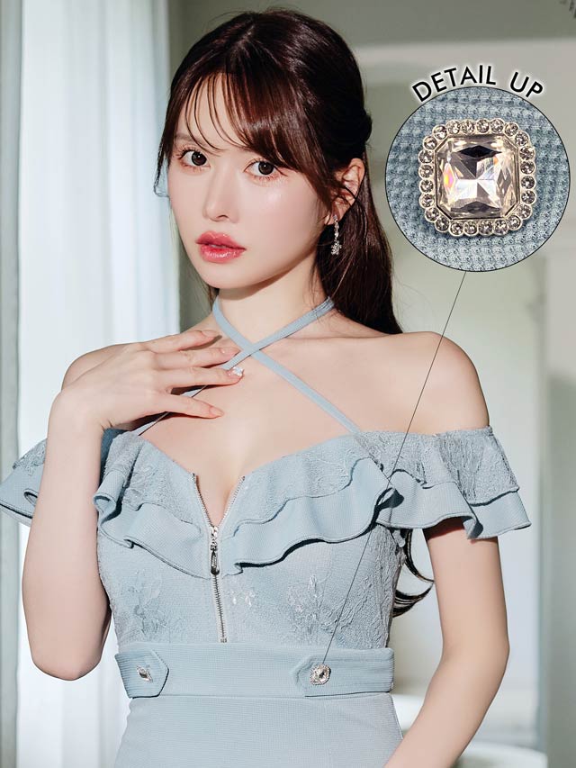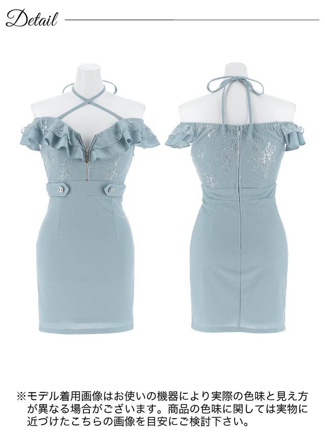 ふんわりとしたフリルレースにフロントジップの谷間魅せが甘めセクシーなミニドレス。女性らしい華奢なクロスラインがデコルテを華やかさに着飾ります♪ オフショル仕様なのでお顔周りをスッキリ魅せてくれるのもポイントです!