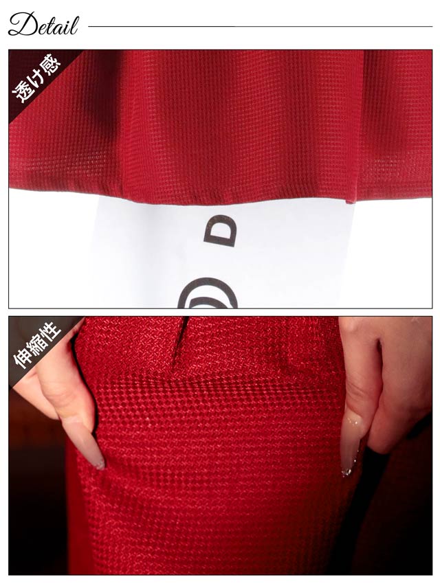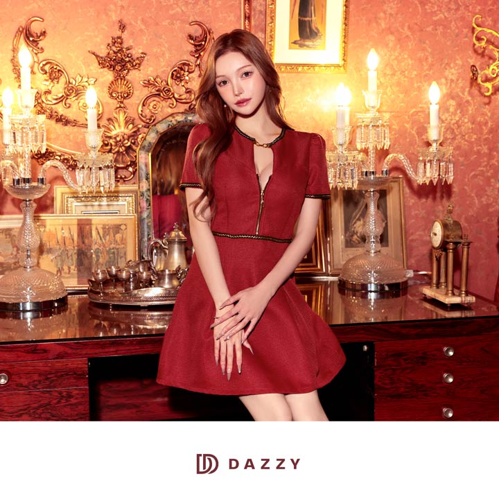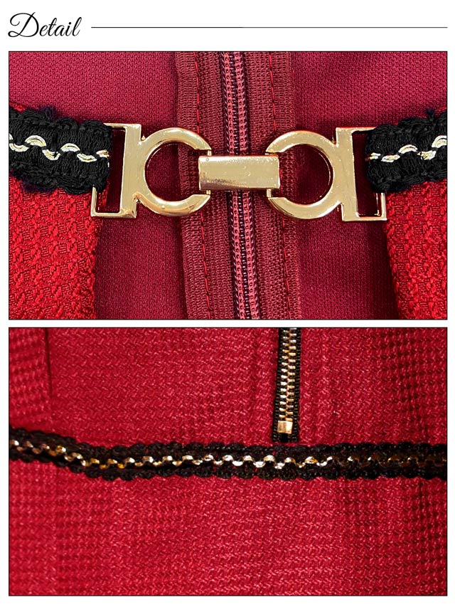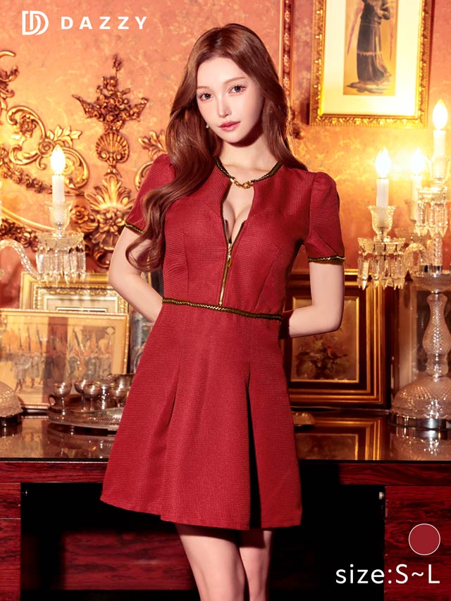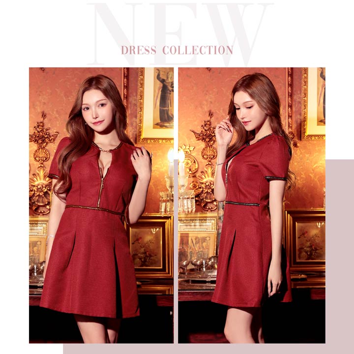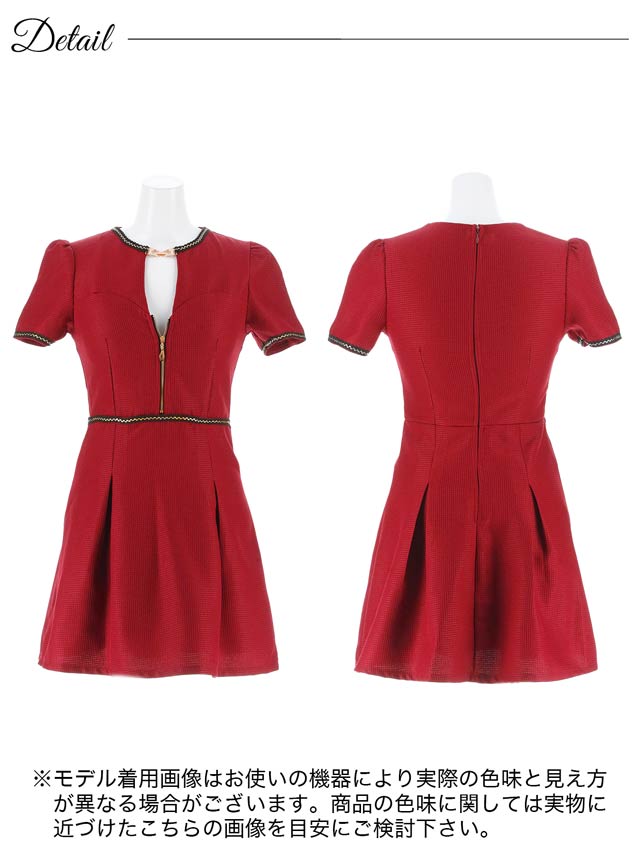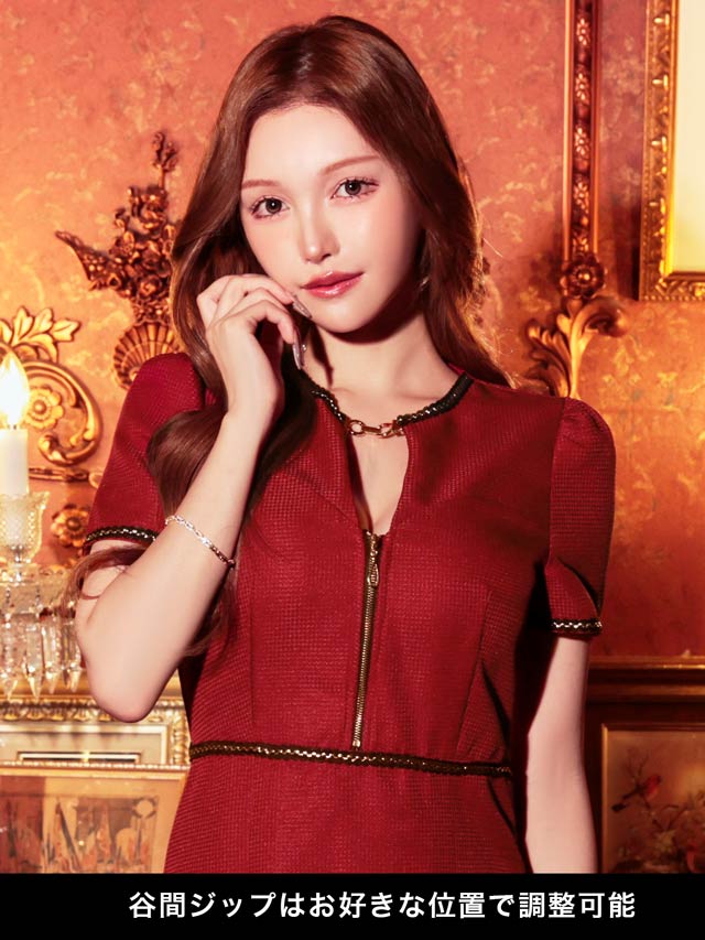 色鮮やかなワインレッドにゴールド×ブラックの刺?デザインが存在感溢れるミニドレス。首元にはキラリと輝くビジューと谷間ホールの肌魅せが目を惹くワンポイント◎ フロントジップを加え気分に合わせた谷間魅せコーデが出来る1着です♪