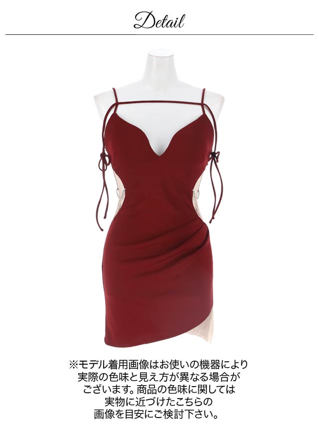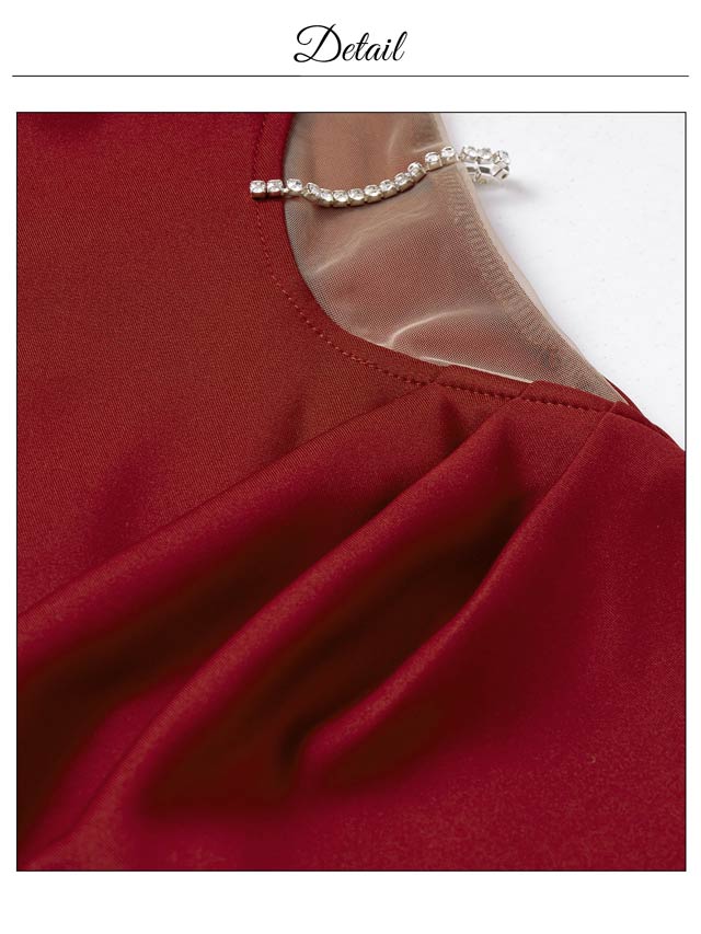 くびれラインを際立たせるシアー素材に煌びやかなビジューがアクセントになったミニドレス。デコルテから腕周りを華やかに演出する華奢なコード使いが女性らしい抜け感を与えてくれます◎ 大きく開いた胸元や後ろ姿からも色気漂う1着です。
