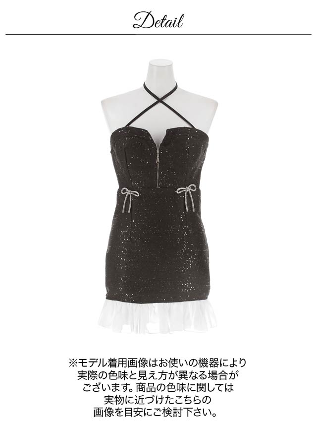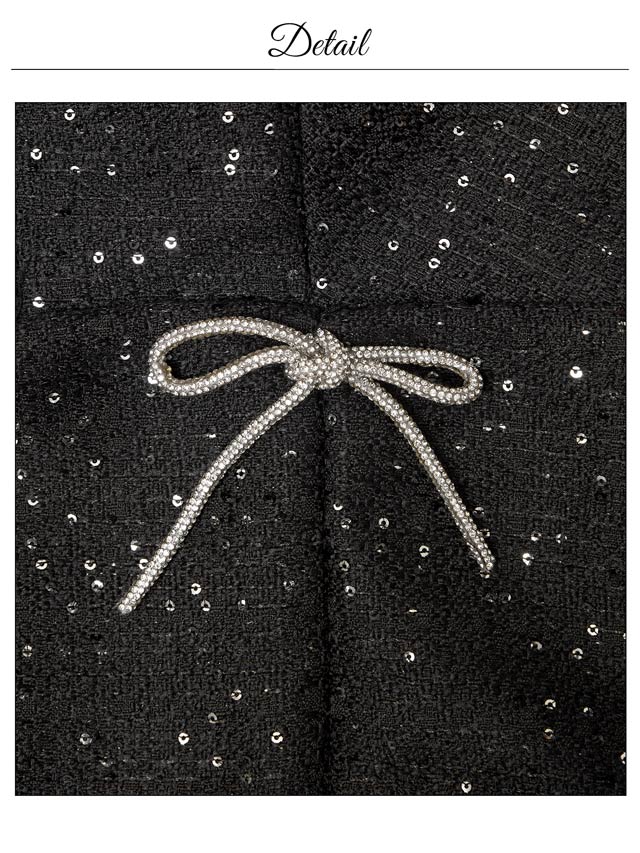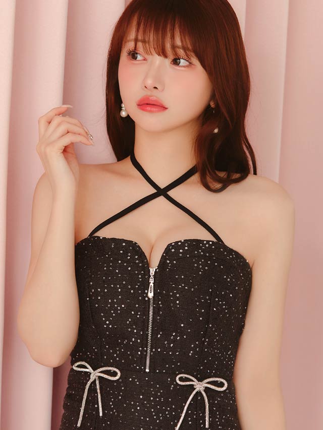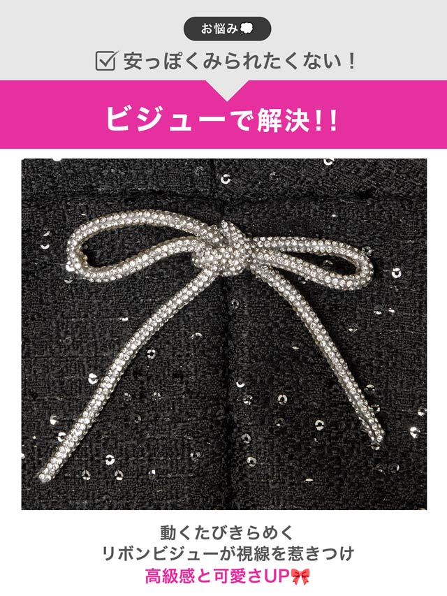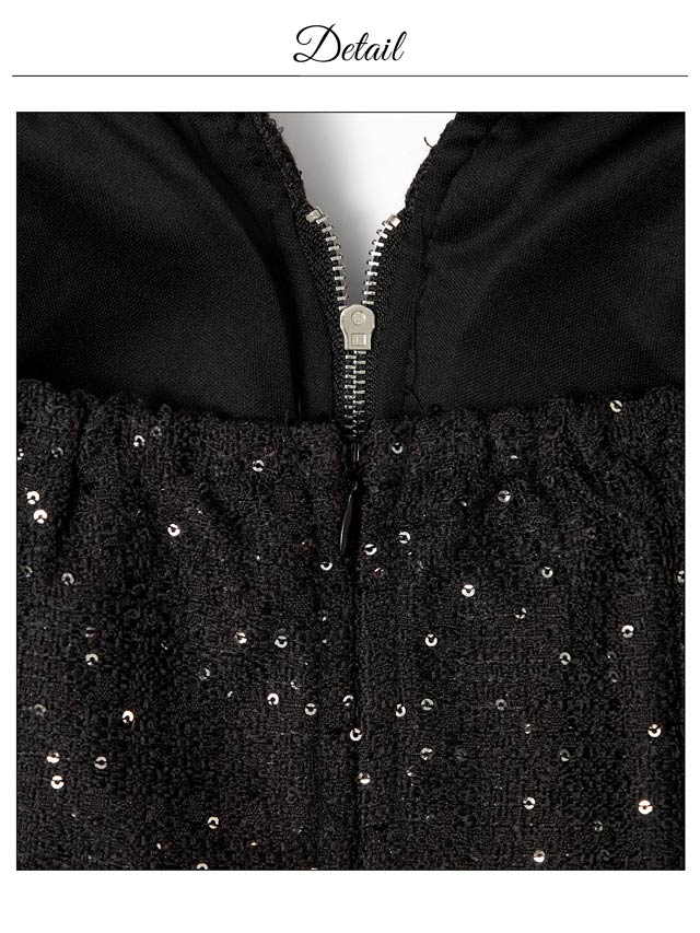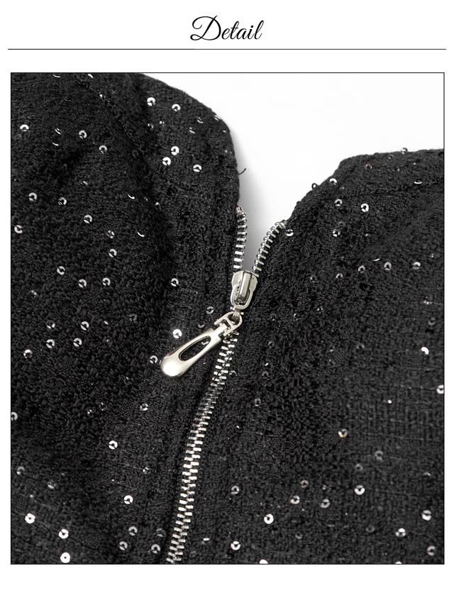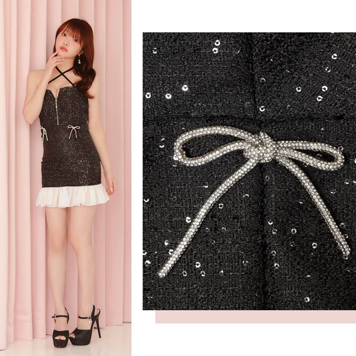 上品なツイード素材にキラリと輝くスパンコールを全面にあしらったミニドレス。華奢なクロスネックとフロントジップ仕様がバストラインを際立たせます◎ 両サイドのリボンビジューも華やかなアクセントになった1着です。