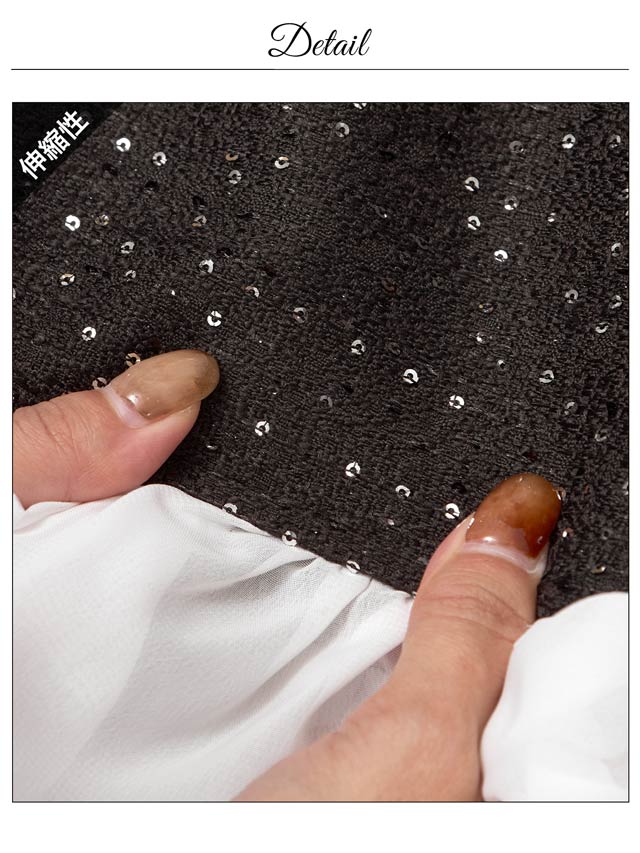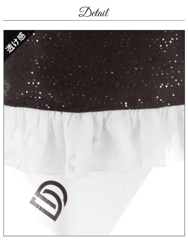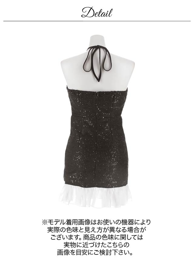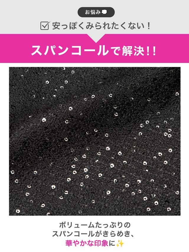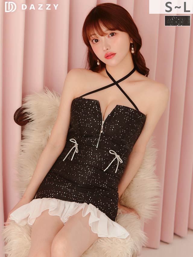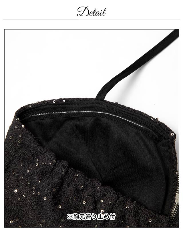 上品なツイード素材にキラリと輝くスパンコールを全面にあしらったミニドレス。華奢なクロスネックとフロントジップ仕様がバストラインを際立たせます◎ 両サイドのリボンビジューも華やかなアクセントになった1着です。