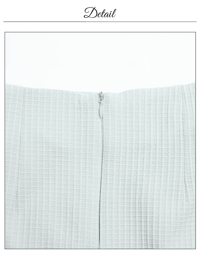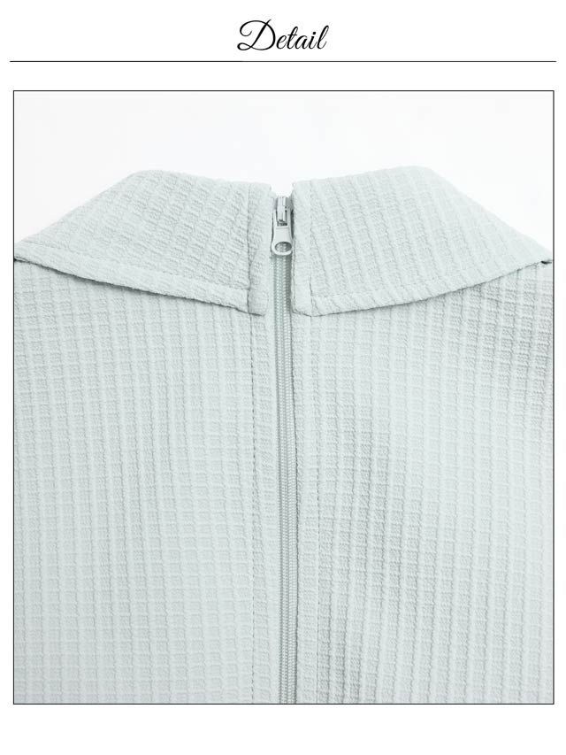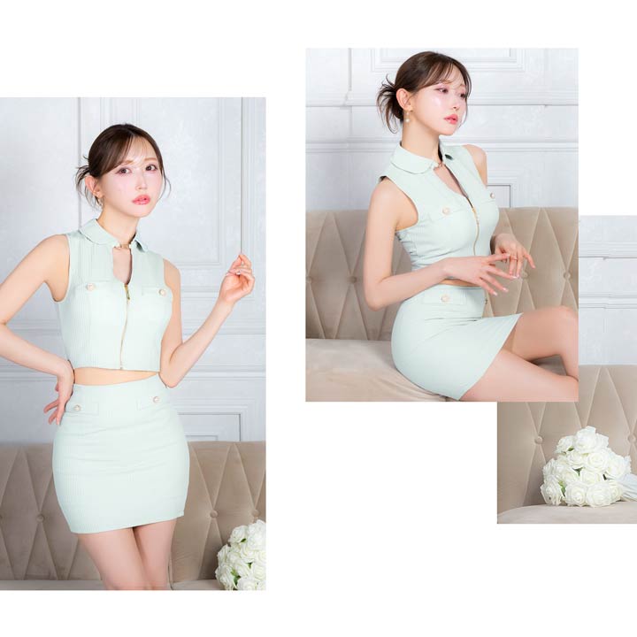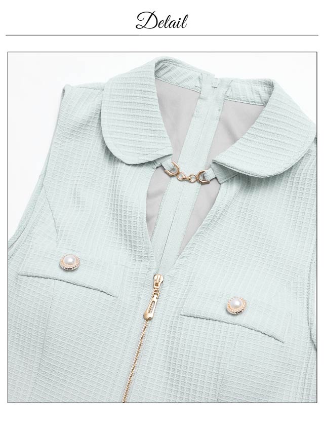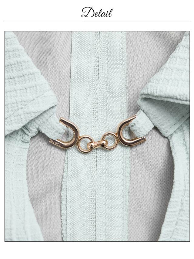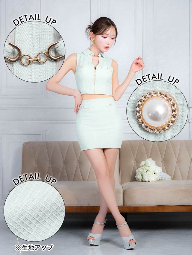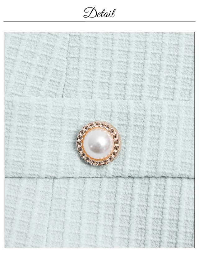 襟付きデザインと立体的なワッフル生地が高級感を漂わせるキャバドレス。煌びやかな首元のチェーン装飾やパールボタンの上品さが大人レディ感溢れるアクセントに◎ セットアップ仕様で着脱が楽ちんなのも嬉しいポイントです。
